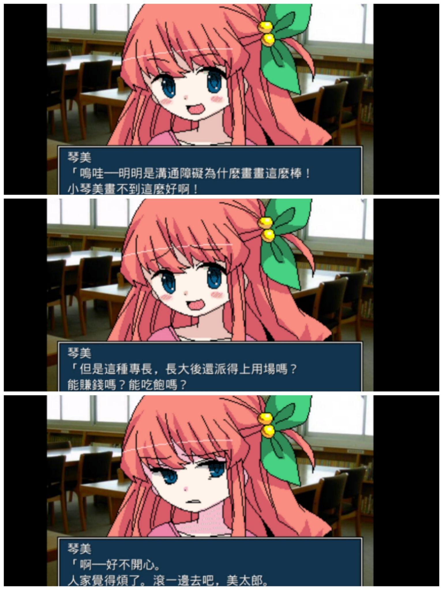 个人感想:剧情是比较有冲击性的,考虑到作者Charon仍然打上了病娇标签,游戏中的琴美应该是孤立诱导和人格贬低类型的病娇。但是不管怎么说这种行为都原谅不了。