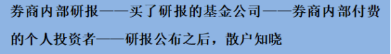 几乎所有的品牌券商都有自己的研究院,都会对宏观的经济环境,宏观的行业发展和微观的实际企业进行分析研究,并将研究成果以研报的形势进行呈现。当这些研报出来的时候,首先当然是券商自己内部最先知道;然后是买了研报的基金公司这类机构知道(当然基金公司和机构本来也会去自行调查);再接着是券商内部付费订阅的个人投资者;最后才是研报公开后,所有的散户才知道。