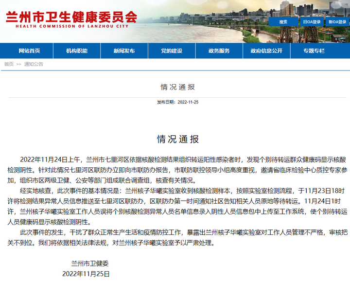 11月25日,兰州市卫健委通报,11月24日上午,兰州市七里河区依据核酸检测结果组织转运阳性感染者时,发现个别待转运群众健康码显示核酸检测阴性;其中,兰州核子华曦实验室工作人员误将个别核酸检测异常人员名单信息录入阴性人员信息包中上传至工作系统,使个别待转运人员健康码显示核酸检测阴性。