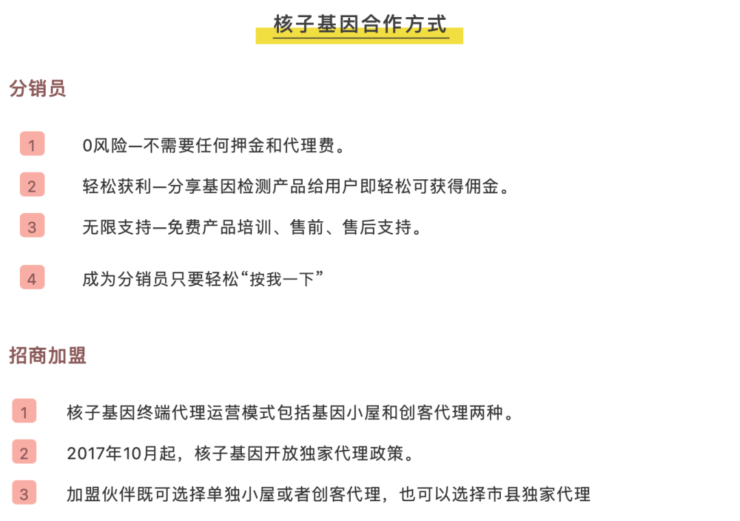 据《南方周末》,一位核子基因的招商经理介绍,目前代理分为创客模式和独家模式两种,均无需加盟代理费,代理商也无需有医学背景。合作方式为代理商负责推广销售产品,核子基因负责检测和售后。
