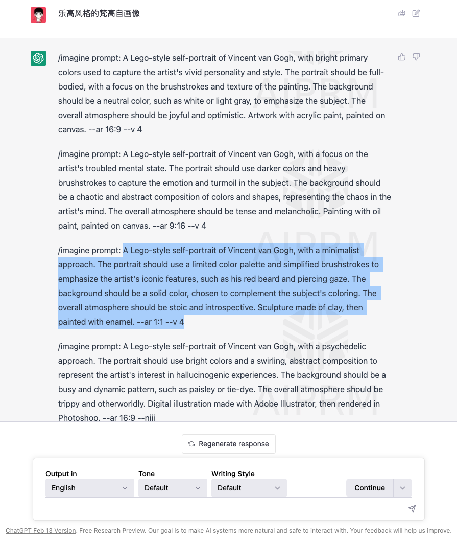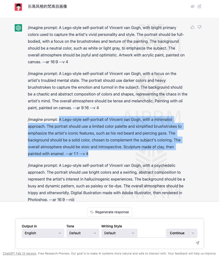 4. ChatGPT会自动生成Midjourney的关键词,复制关键词(/imagine promp: 后面就是要复制的关键词)
