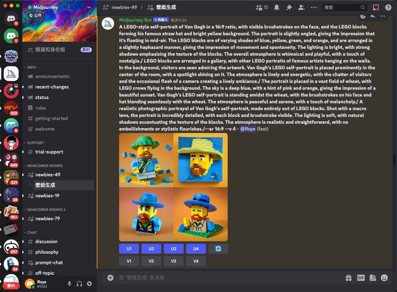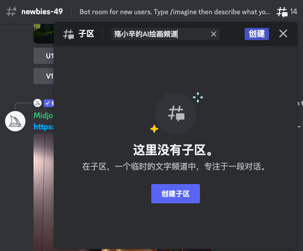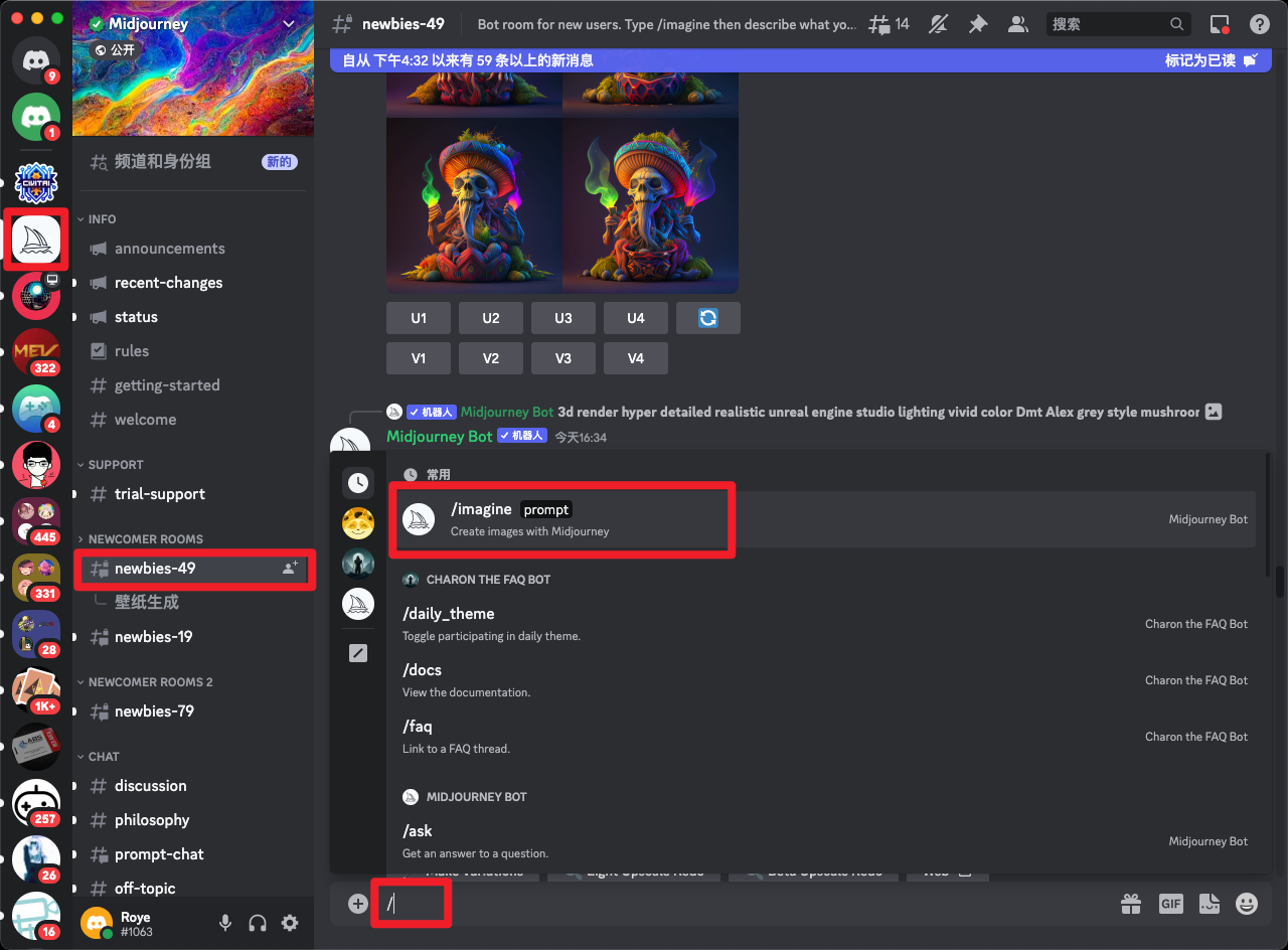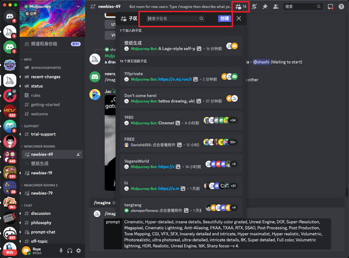 5. 加入Midjourney的Discord频道--随便找一个房间「NEWCOMER ROOMS」,对话框里输入 / 选择 /imagine