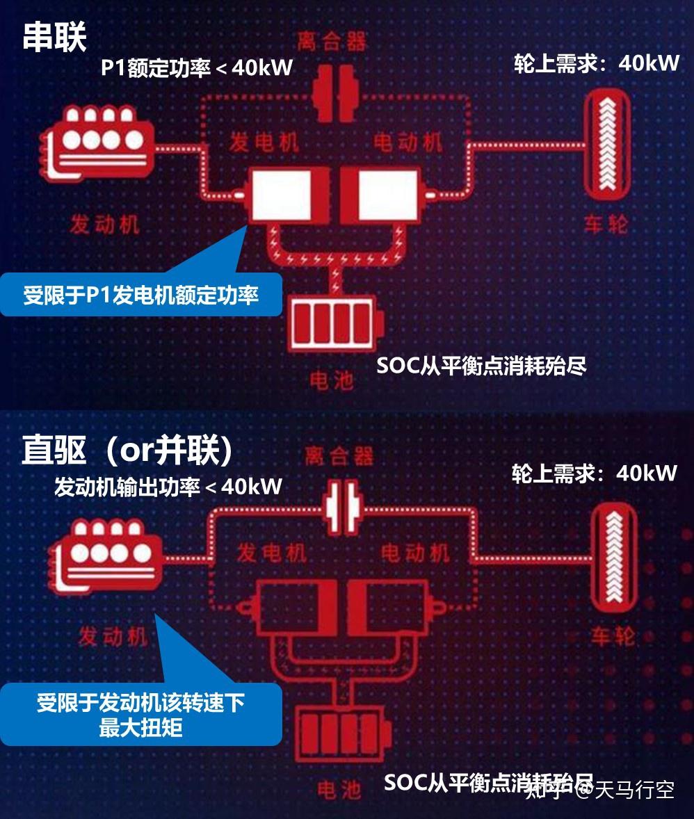 举个例子,假设在高原地区高速维持在100km/h,平路上需求功率可能是20kW,爬坡需要40kW功率。如果是直驱模式,由于单挡DHT的传动比限制,发动机转速是固定的,又因为高原气压低,此转速下发动机输出功率达不到40kW,如果把电池SOC耗完了,那么就会彻底失速。这有点像大家开手动挡燃油车挂高挡位上坡,会发现即使油门踩死也没法加速,甚至发动机熄火,这是一个道理。如果是串联模式呢?串联模式理论上发动机在高转速下输出功率是可以超过40kW的,但是物理制约条件之一有发电机输出功率,一般行业P2电机可以做到100kW以上,但是P1电机功率会比较小,峰值功率几十kW,额定功率就更小了,长期上坡由于热负荷等问题,P1电机的功率会跟不上,也导致充电功率达不到40kW,等电池彻底没电,也就失速了。