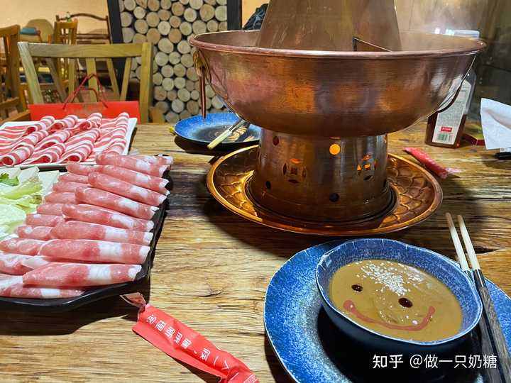 一个人要个鸳鸯锅,一边红一边白,一边麻辣一边骨汤,要半份牛肉卷,半份羊肉卷,半份午餐肉,半份牛肉丸,手打的最好,最不济也要个开花的,半份虾滑,半份香菜。