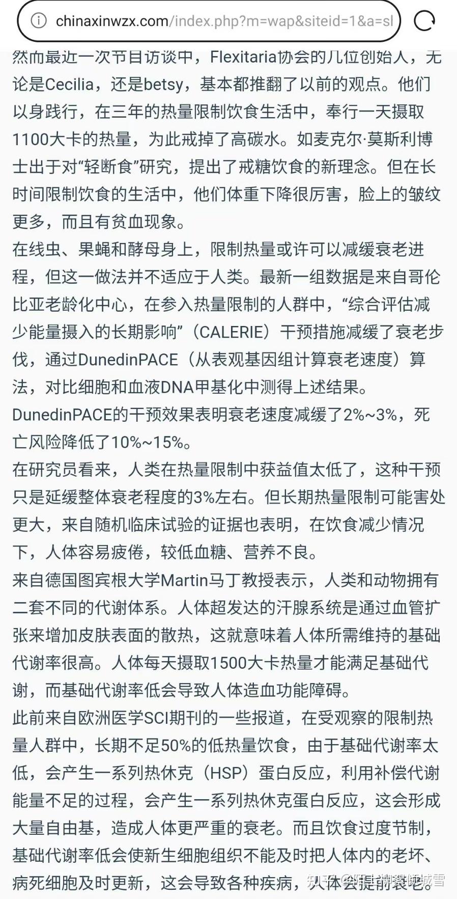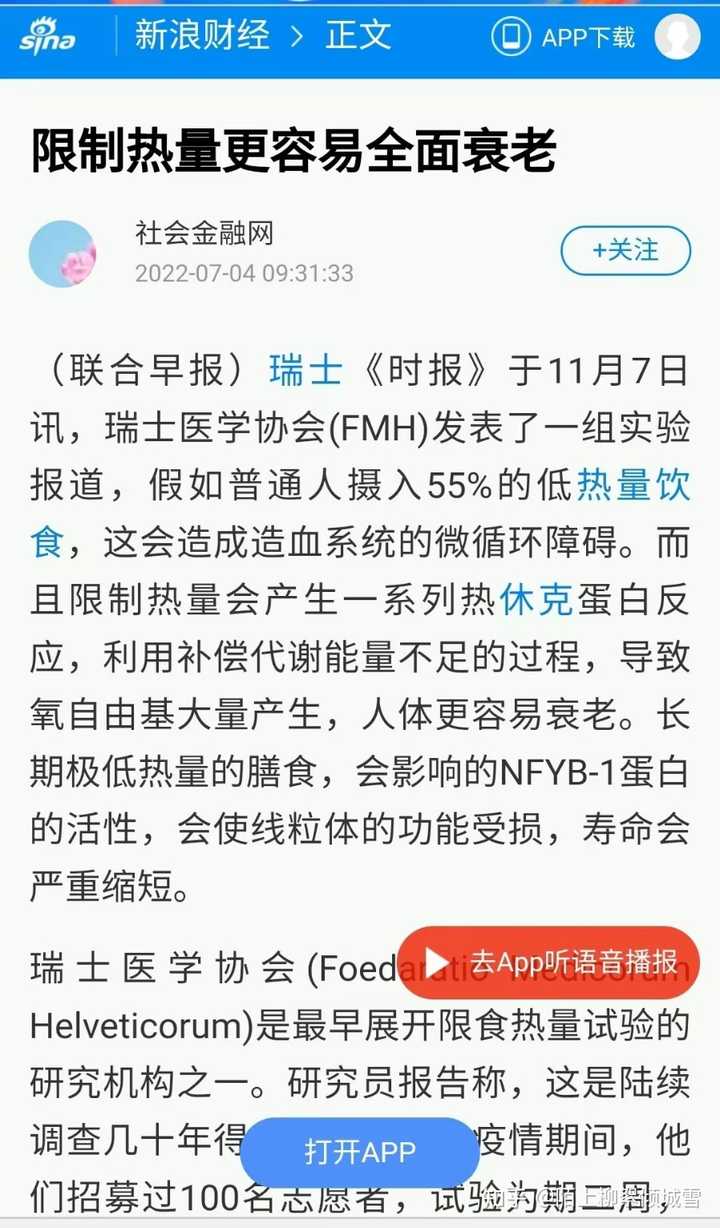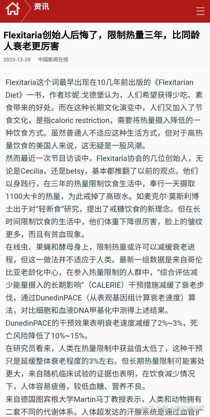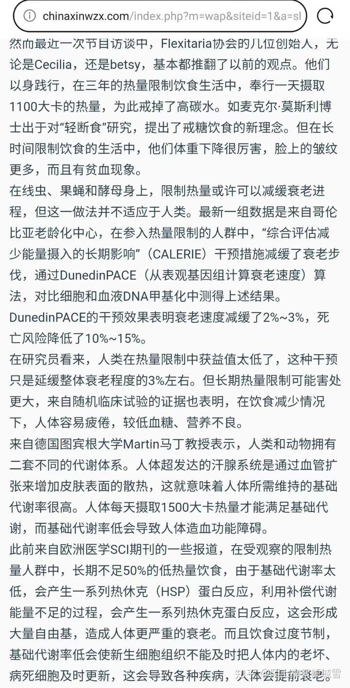 - 3 个点赞 👍长期轻断食反而会造成衰老,影响寿命。很多人单单听信酵母及果蝇、线虫限制热量的案例,这和人类完全不一样。 特注:人体每天基础代谢需要的热量都要1500大卡,人体在热量不足的情况下,蛋白质氨基酸第一时间转为热量,所以很多女士每天喝牛奶和蛋白粉,一样会营养不良。 为什么那么多节食女性,变的衰老异常?人体的组织结构,小到细胞膜合成,大到血液更新,都需要蛋白质。哪怕是缺少胶原蛋白,皮肤都会起皱纹。 早期人类是通过碳水化合物提供提供营养和热量。在热量不足情况下,就得由其他的营养比如氨基酸或者蛋白质转化为糖分。 我们来看一些实例:一些人长期低热量饮食,固然瘦了,但是反而显老了,皱纹更多。 二,Flexitaria创始人后悔了,限制热量三年,比同龄人衰老更厉害 信源:中国新闻在线 特注:文章中提到试验是来自《自然》子刊Nature Aging上发表了CALERIE 临床试验的一项二次分析报道,由哥伦比亚大学Mailman公共卫生学院领衔的国际研究小组, 根据对DNA甲基化的评估,提供了热量限制可以减缓衰老的新证据。 根据研究团队的介绍,纳入这项CALERIE试验的220名志愿者被随机分为两组,其中 被分配到“热量限制“组的参与者,在长达2年时间的试验期间,日常热量摄入要在原先的基础上减少30%;是根据DNA甲基化数据计算一个人的生理年龄,以及判断个体衰老的速度。 最终结论:DunedinPACE的分析结果显示, 热量限制让参与者的生理衰老速度减缓了2%~3%。参考其他相关研究, 这一速度变慢意味着死亡风险降低10%~15%,与戒烟的好处相当。 这一结论让很多科学界大跌眼镜,这和以往果蝇及线虫、小鼠的热量限制试验结果完全不同。在同时期的一些动物学观察试验中,酵母往往可以延长30%的寿命。 知乎也有相关报道: 澎拜新闻: 三,过度限制热量会造成人体严重衰老 转载全文: (联合早报)瑞士《时报》于11月7日讯,瑞士医学会(FMH)发表了一组实验报道,假如普通人摄入55%的低热量饮食,这会造成造血系统的微循环障碍。而且限制热量会产生一系列热休克蛋白反应,利用补偿代谢能量不足的过程,导致氧自由基大量产生,人体更容易衰老。长期极低热量的膳食,会影响的NFYB-1蛋白的活性,会使线粒体的功能受损,寿命会严重缩短。 瑞士医学院是最早展开限食热量试验的研究机构之一。研究员报告称,这是陆续调查几十年得出的数据,在疫情期间,他们招募过100名志愿者,试验为期二周,其中六成为男性,四成为女性,有一半以上的志愿者是在医院完成了试验,而这一试验结果和以前的数据大致相同。 研究人员发现,CR(热量限制)与下丘脑中内源性亮啡肽水平升高有关,用药物针对抑制KOR,能完全阻断CR诱导的低温并使体重下降,常见是通过饮食中的热量限制,来改善人类的健康。 早期科学家们使用了简单的秀丽隐杆线虫作为模型,继而以灵长类动物及人类作为的衰老研究对象,但这项研究表明,如果每天摄入55%的低热量饮食,热休克蛋白产生的代谢偿还机制可以导致人类的寿命缩短。同时,研究人员还采用了孟德尔随机化法,发现摄入55%热量更容易引起热休克蛋白反应。假如一个人平躺在床上,大概一天消耗1700Kcal,热休克蛋白(HSPs)是在葡萄糖缺乏、饥饿、缺血、寒冷、创伤、中毒、重金属、高温、缺氧、高压氧中所诱导产生,热休克蛋白对于维持细胞代谢有了重要作用,研究人员猜想,这一诱因可能与能量摄取不足有关。而利用补偿代谢能量不足的过程,会导致氧自由基大量产生。 而且长期极低热量限食和缺乏营养的膳食会影响NFYB-1的核蛋白的活性,NFYB-1主导溶酶体影响线粒体的活动,溶酶体是作为基本分子并通过营养物质循环的利用机制所在,这导致线粒体的功能受损,生物体寿命会严重缩短,另外热休克蛋白表达过高,容易诱发癌症。 其他一些数据发现,长期限制热量,还会造成血管微循环障碍,导致造血功能紊乱,一些微血管微血栓形成,这进一步造成内脏器官代谢功能和形态损伤。 目前一些初步研究统计,长期摄入80%的低热量饮食则可以预防老年前脂肪细胞中的促炎信号。还可以改善肝脏、脂肪组织、肌原的代谢,降低氧化应激、DNA损伤、及降低炎症、心血管疾病风险。 此前隶属于美国老龄问题研究所自1987年开始从事限制热量摄入与长寿的研究,研究人员将一些灵长类动物分成两组,然而经过20年的限食实验对比,限制热量的猴子并无法提高最终寿命,甚至两者没有任何差异性。 而这项研究表明,当摄入热量饮食低于55%时,热休克蛋白产生的代谢偿还机制可以导致人类的寿命缩短,也会产生更多自由基,人体更容易衰老,因此研究人员建议可以减少20%的热量限制,应该是最大的收益,也就是常说的膳食八分饱,这样可以健康而有活力,适当减少一些热量脂肪,可以多吃蔬菜、坚持运动,适当补充一些动物蛋白,或鸡鸭及鱼肉,如果肥胖症或有冠心病,宜限制高脂肪、高胆固醇类饮食。 如果严格的执行一天一顿饭,杜绝不吃任何其他零食和饮料,本人以性命担保,半年可以瘦40斤,二三年以后肌肉流失十分严重,脸上会产生各种皱纹,30岁的人貌似60岁,而且这种衰老是不可逆的。 人民网:长期节食而严重衰老,艾玛沃特森衰老太厉害 艾玛31岁怎么老得这么快?全素颜上阵,没开美颜,脸上各种法令纹,皮肤丝毫没有弹性......…媒体惊呼,艾玛看上去更像是过年半百的老妇人,节食毁了