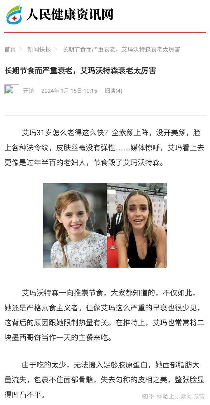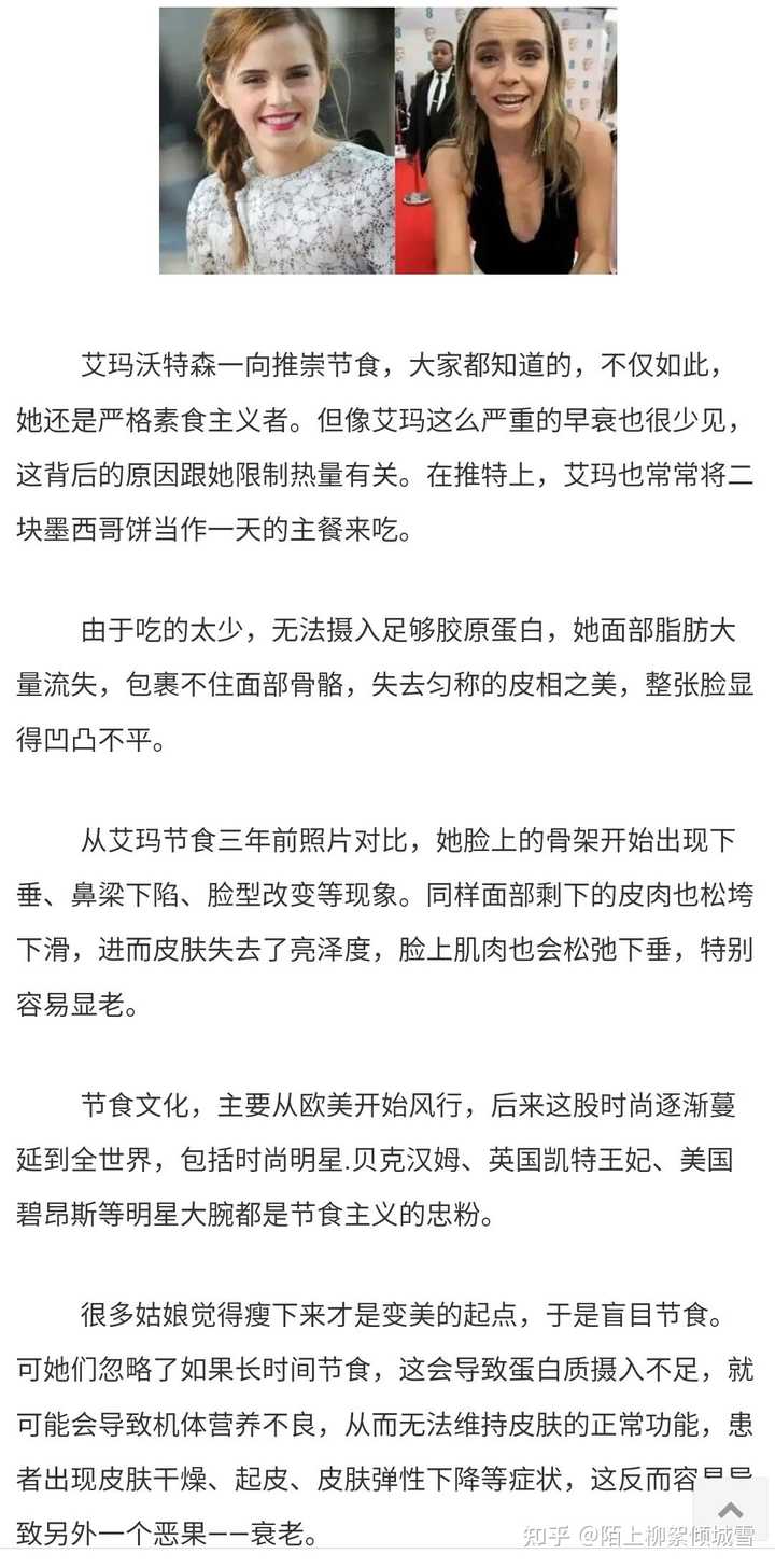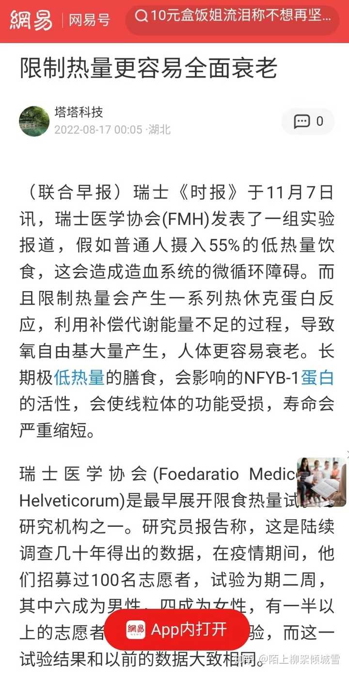 - 3 个点赞 👍长期轻断食反而会造成衰老,影响寿命。很多人单单听信酵母及果蝇、线虫限制热量的案例,这和人类完全不一样。 特注:人体每天基础代谢需要的热量都要1500大卡,人体在热量不足的情况下,蛋白质氨基酸第一时间转为热量,所以很多女士每天喝牛奶和蛋白粉,一样会营养不良。 为什么那么多节食女性,变的衰老异常?人体的组织结构,小到细胞膜合成,大到血液更新,都需要蛋白质。哪怕是缺少胶原蛋白,皮肤都会起皱纹。 早期人类是通过碳水化合物提供提供营养和热量。在热量不足情况下,就得由其他的营养比如氨基酸或者蛋白质转化为糖分。 我们来看一些实例:一些人长期低热量饮食,固然瘦了,但是反而显老了,皱纹更多。 二,Flexitaria创始人后悔了,限制热量三年,比同龄人衰老更厉害 信源:中国新闻在线 特注:文章中提到试验是来自《自然》子刊Nature Aging上发表了CALERIE 临床试验的一项二次分析报道,由哥伦比亚大学Mailman公共卫生学院领衔的国际研究小组, 根据对DNA甲基化的评估,提供了热量限制可以减缓衰老的新证据。 根据研究团队的介绍,纳入这项CALERIE试验的220名志愿者被随机分为两组,其中 被分配到“热量限制“组的参与者,在长达2年时间的试验期间,日常热量摄入要在原先的基础上减少30%;是根据DNA甲基化数据计算一个人的生理年龄,以及判断个体衰老的速度。 最终结论:DunedinPACE的分析结果显示, 热量限制让参与者的生理衰老速度减缓了2%~3%。参考其他相关研究, 这一速度变慢意味着死亡风险降低10%~15%,与戒烟的好处相当。 这一结论让很多科学界大跌眼镜,这和以往果蝇及线虫、小鼠的热量限制试验结果完全不同。在同时期的一些动物学观察试验中,酵母往往可以延长30%的寿命。 知乎也有相关报道: 澎拜新闻: 三,过度限制热量会造成人体严重衰老 转载全文: (联合早报)瑞士《时报》于11月7日讯,瑞士医学会(FMH)发表了一组实验报道,假如普通人摄入55%的低热量饮食,这会造成造血系统的微循环障碍。而且限制热量会产生一系列热休克蛋白反应,利用补偿代谢能量不足的过程,导致氧自由基大量产生,人体更容易衰老。长期极低热量的膳食,会影响的NFYB-1蛋白的活性,会使线粒体的功能受损,寿命会严重缩短。 瑞士医学院是最早展开限食热量试验的研究机构之一。研究员报告称,这是陆续调查几十年得出的数据,在疫情期间,他们招募过100名志愿者,试验为期二周,其中六成为男性,四成为女性,有一半以上的志愿者是在医院完成了试验,而这一试验结果和以前的数据大致相同。 研究人员发现,CR(热量限制)与下丘脑中内源性亮啡肽水平升高有关,用药物针对抑制KOR,能完全阻断CR诱导的低温并使体重下降,常见是通过饮食中的热量限制,来改善人类的健康。 早期科学家们使用了简单的秀丽隐杆线虫作为模型,继而以灵长类动物及人类作为的衰老研究对象,但这项研究表明,如果每天摄入55%的低热量饮食,热休克蛋白产生的代谢偿还机制可以导致人类的寿命缩短。同时,研究人员还采用了孟德尔随机化法,发现摄入55%热量更容易引起热休克蛋白反应。假如一个人平躺在床上,大概一天消耗1700Kcal,热休克蛋白(HSPs)是在葡萄糖缺乏、饥饿、缺血、寒冷、创伤、中毒、重金属、高温、缺氧、高压氧中所诱导产生,热休克蛋白对于维持细胞代谢有了重要作用,研究人员猜想,这一诱因可能与能量摄取不足有关。而利用补偿代谢能量不足的过程,会导致氧自由基大量产生。 而且长期极低热量限食和缺乏营养的膳食会影响NFYB-1的核蛋白的活性,NFYB-1主导溶酶体影响线粒体的活动,溶酶体是作为基本分子并通过营养物质循环的利用机制所在,这导致线粒体的功能受损,生物体寿命会严重缩短,另外热休克蛋白表达过高,容易诱发癌症。 其他一些数据发现,长期限制热量,还会造成血管微循环障碍,导致造血功能紊乱,一些微血管微血栓形成,这进一步造成内脏器官代谢功能和形态损伤。 目前一些初步研究统计,长期摄入80%的低热量饮食则可以预防老年前脂肪细胞中的促炎信号。还可以改善肝脏、脂肪组织、肌原的代谢,降低氧化应激、DNA损伤、及降低炎症、心血管疾病风险。 此前隶属于美国老龄问题研究所自1987年开始从事限制热量摄入与长寿的研究,研究人员将一些灵长类动物分成两组,然而经过20年的限食实验对比,限制热量的猴子并无法提高最终寿命,甚至两者没有任何差异性。 而这项研究表明,当摄入热量饮食低于55%时,热休克蛋白产生的代谢偿还机制可以导致人类的寿命缩短,也会产生更多自由基,人体更容易衰老,因此研究人员建议可以减少20%的热量限制,应该是最大的收益,也就是常说的膳食八分饱,这样可以健康而有活力,适当减少一些热量脂肪,可以多吃蔬菜、坚持运动,适当补充一些动物蛋白,或鸡鸭及鱼肉,如果肥胖症或有冠心病,宜限制高脂肪、高胆固醇类饮食。 如果严格的执行一天一顿饭,杜绝不吃任何其他零食和饮料,本人以性命担保,半年可以瘦40斤,二三年以后肌肉流失十分严重,脸上会产生各种皱纹,30岁的人貌似60岁,而且这种衰老是不可逆的。 人民网:长期节食而严重衰老,艾玛沃特森衰老太厉害 艾玛31岁怎么老得这么快?全素颜上阵,没开美颜,脸上各种法令纹,皮肤丝毫没有弹性......…媒体惊呼,艾玛看上去更像是过年半百的老妇人,节食毁了