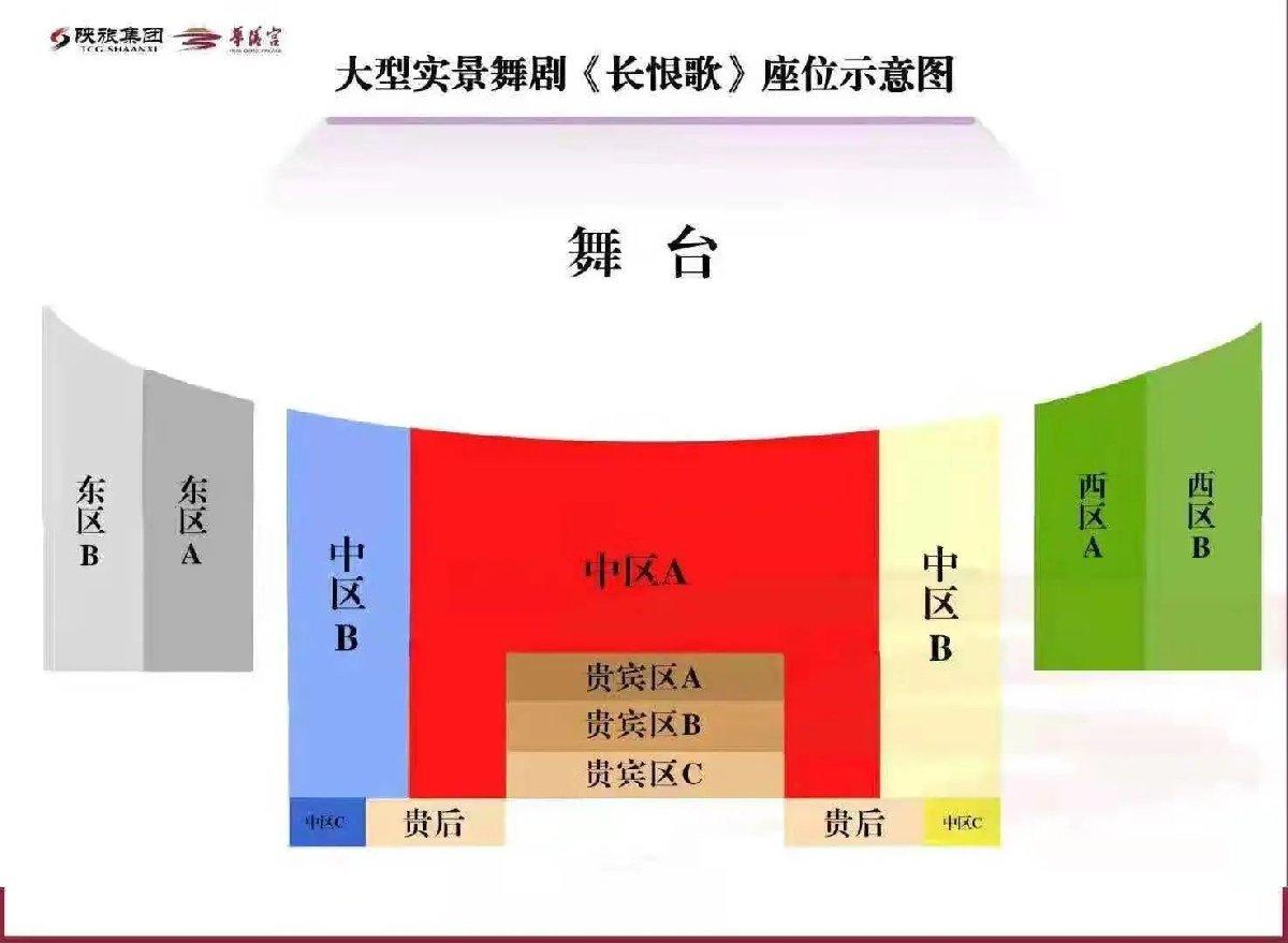 观众座位区分为4个区域,分别是中区A、中区B、东西区A、东西区B,强烈建议大家坐中区,因为舞台是中轴对称的结构,中区的视觉是最震撼的,因为演出过程中会有水火,如果害怕被溅水,可以购买中区B!