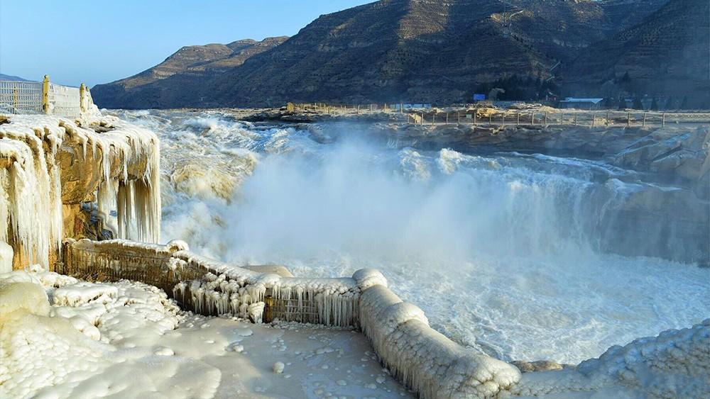 要说最特别的就是凌汛,壶口瀑布两岸已经被冰封,没有了往日汹涌的气势,黄河水伴随着片片流凌来到壶口瀑布,整个黄河成为了冰雪世界,冰块层层相叠挤压在一起,这就是壶口瀑布著名的景观“壶口冰凌”。