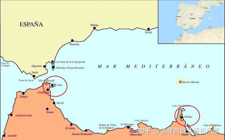 淘汰赛中,摩洛哥将要对阵的是西班牙,很多同学都知道这两国隔海相望,但你知道两国的土地还是接壤的吗?西班牙的两块飞地——休达Ceuta和梅利利亚Melilla都被摩洛哥的国土包围,作为自治市存在于摩洛哥边境,这也是非洲大陆上仅有的两块欧盟领土。