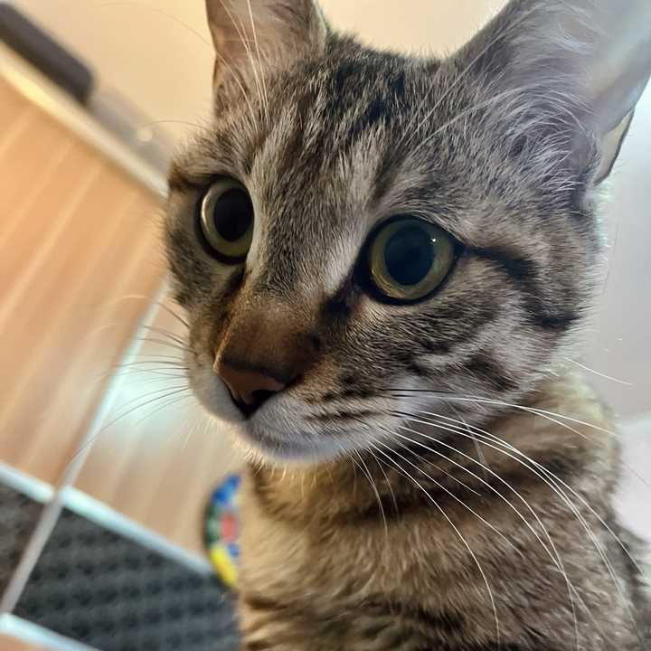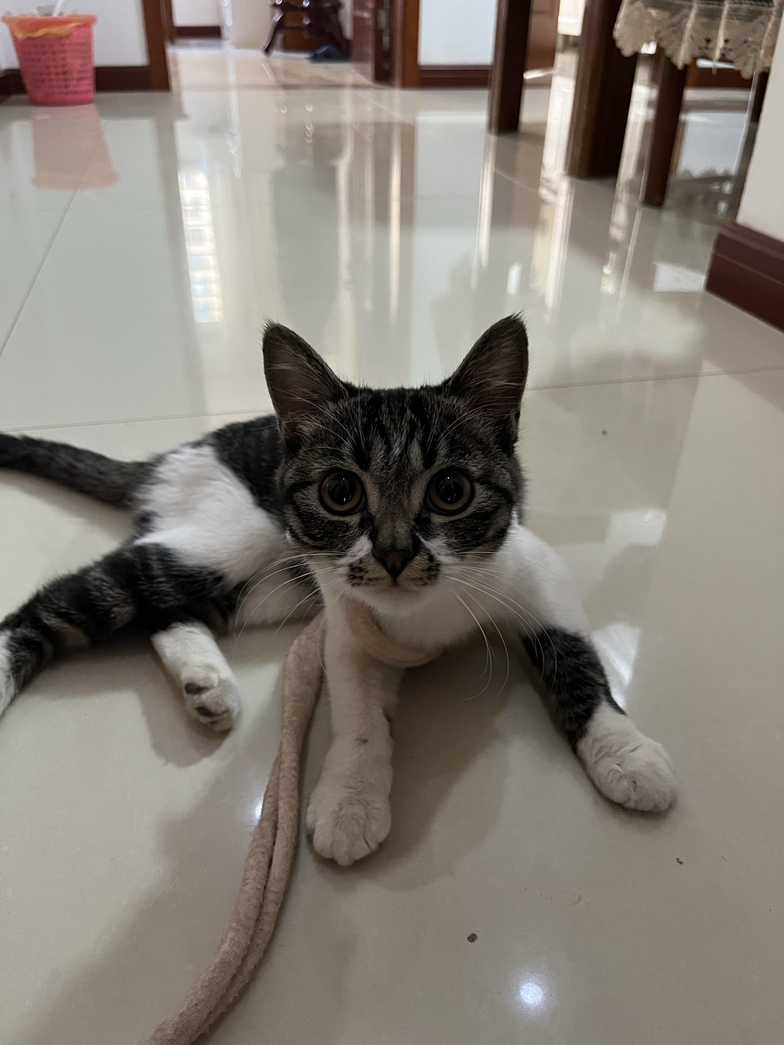 缺点也有,爱好就是喜欢扒沙发,天天扒沙发,一眼看不见它就是在扒沙发,根本就停不下来,打也没用。以前奶牛猫小时候也扒沙发,长大了就不扒了。这小花猫把我妈气的就拿绳子拴到奶牛猫身上,让奶牛猫看着它。然后说我自己家的,是只母狸花猫,两个半月的时候家附近水果店老板送的,现在大概十个月大。在狸花猫里我不是特别喜欢它的颜值,脑袋小而且是尖的,脸上没肉。
