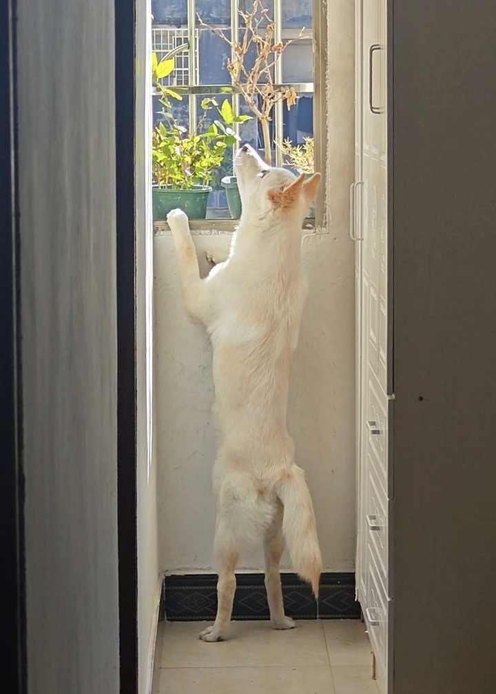 我家小lucky,今天下去看见了两只小麻雀在马路上,突然跑过去然后急转弯,吓飞了两只小麻雀,然后自己美滋滋的去玩了~给它一个吃的,想要衔走,然后偷偷瞄着我,慢慢咬住,当着我的面,蹑手蹑脚的跑回了自己的窝~