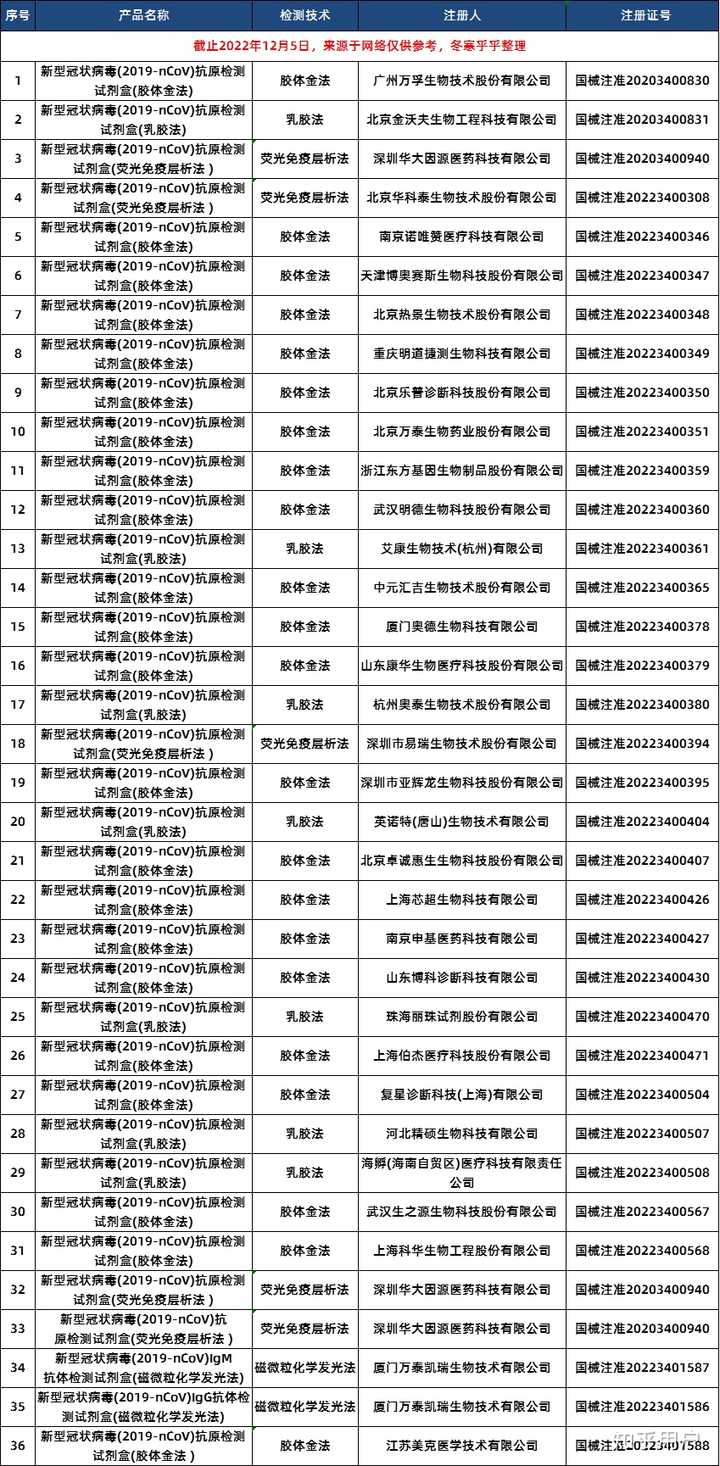截止2022年12月5日,国家药监局已批准36个检测实剂产品,其中胶体金法有22款产品,乳胶法7款,荧光免疫层析法 5款,磁微粒化学发光法2款。而在广东省共有5家生产新冠病毒抗原检测试剂的生产企业,包括广州万孚生物、深圳亚辉龙生物、深圳华大因源医药、深圳市易瑞生物、珠海丽珠试剂。
