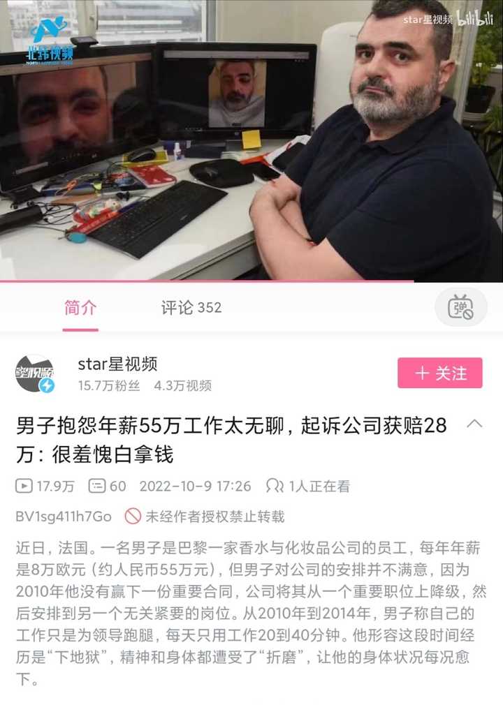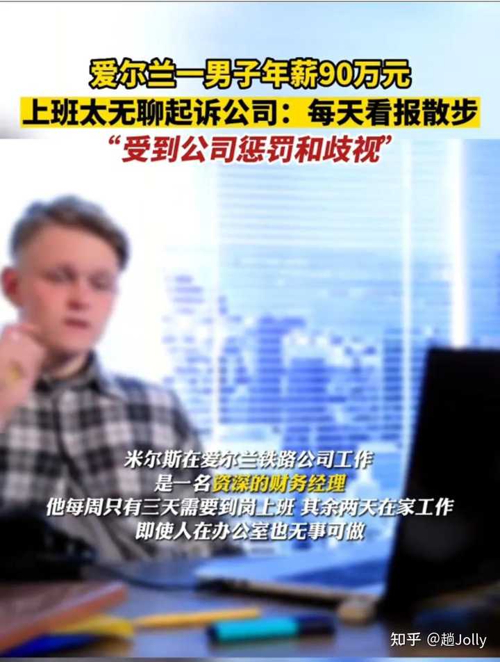 - 13 个点赞 👍爱尔兰的一位财务经理,年薪人民币90万,因上班无事可做,太无聊了,于是把公司告上了法庭。 米尔斯是一名财务经理,在爱尔兰一家铁路公司上班,不仅周末双休,他还不用每天去公司办公室工作,一周只要去3天就行,其他2天居家办公。 更气人的是,去了办公室也无事可做,更别说居家办公的2天了,公司更是一点活都不给他安排。 据报道,米尔斯每天上午10点到办公室,然后不是开始干活,而是一边看报纸一边嚼着三明治消磨时间。 工作邮箱里收到的邮件,几乎跟他的工作无关,公司也没有给他安排什么工作。 中午吃完午饭,他就开始休息,到了下午两点半或三点钟左右再回去上班。 算下来,米尔斯一年能赚10.5万英镑(约人民币90万元)。 但米尔斯认为,现在的工作实在太清闲太无聊了,无法体现他的个人价值,因为没有工作内容,跟其他同事也没有交集,自己受到了公司的惩罚和歧视。 于是米尔斯将公司告上了法庭,目前案件正在审理中。 米尔斯的工作你羡慕吗?反正我是慕了! 可能我是俗人,如果公司能给我90万年薪,还不给我安排工作,每周居家办公2天,去公司3天摸鱼,这工作我能干到退休,退休返聘也不是不可以。 哈哈,如果能遇到这种工作,还要体现什么人生价值啊,公司尽情的用这种方式惩罚和歧视我吧,通通接受,我愿意被同事当做透明人。 发布于 2022-12-04 18:46・IP 属地山西查看全文>> 趟Jolly
