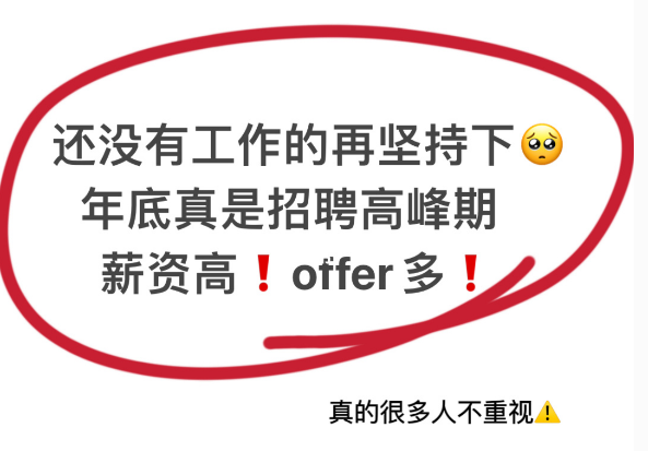 一、真实岗位放出,竞争比金三银四低的多每个公司都会在年底进行人员盘点,该优化的优化,该招人的招人,且年底是各个部门最忙的阶段 这时候如果还能放出来招聘信息,基本都是真实岗位了,不会是为了刷kpi… 这时,你就可以错峰面试,捡漏好机会 因为在职的同学都会等13薪或年终奖,长期找不到工作的也会选择先回家过年,来年再说 那这时候偷偷开卷就对了,无论是跳槽还是应届生找工作,都很适合 但凡是放到明年招聘的岗位,都会有比现在多十倍的人去竞争,到时候薪资难谈,offer也更难拿了