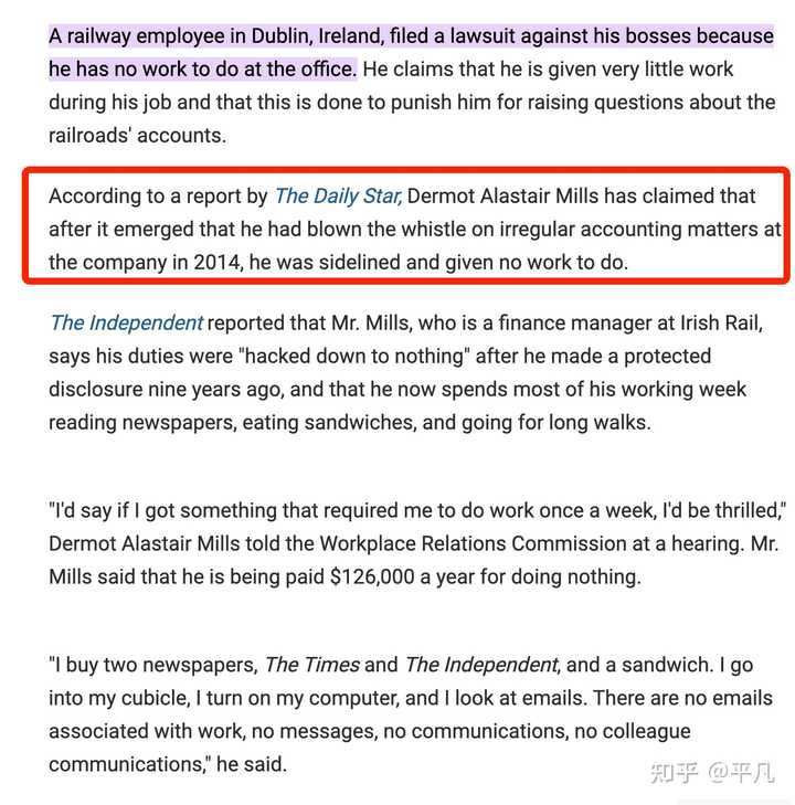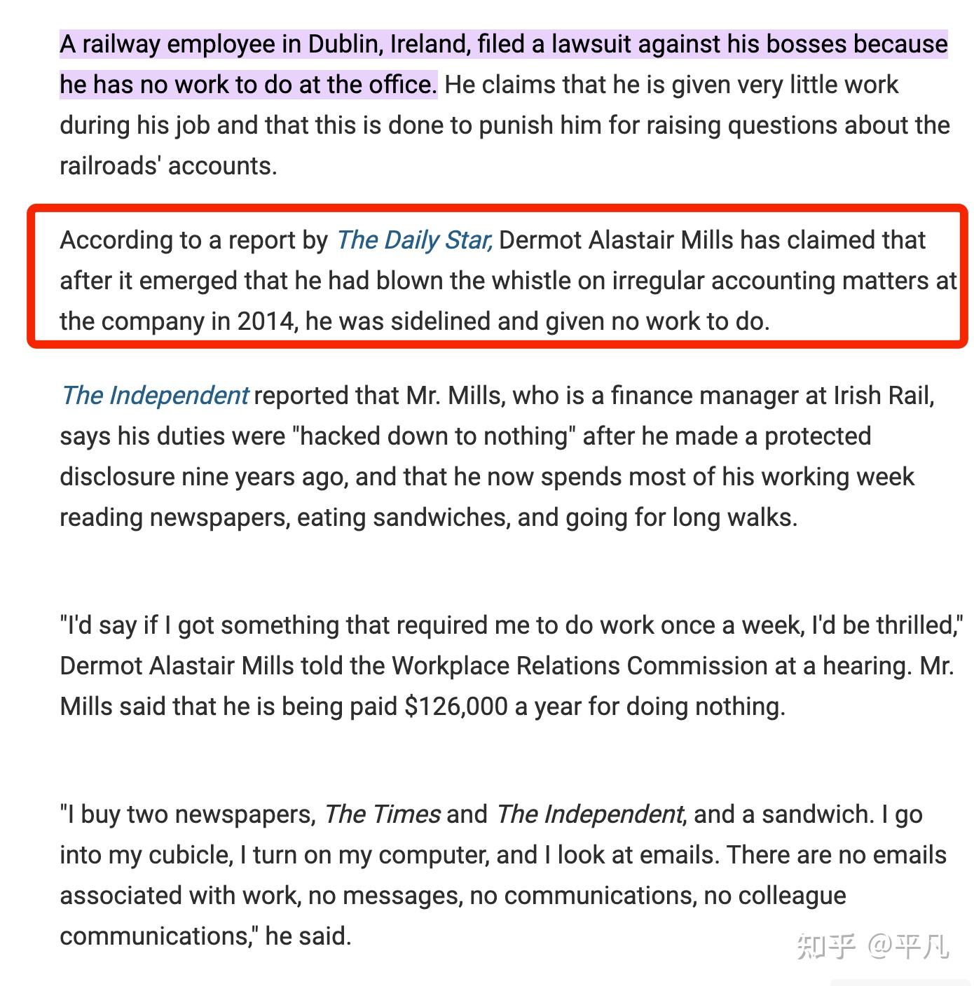 - 2238 个点赞 👍我知道文案写作中有一个技巧叫“缩写”,但也架不住这么缩啊,1000+字的报道被你们缩成131个字...... 来看看事情原委吧:米尔斯是一名在爱尔兰铁路公司工作了20多年的老员工,曾身居要职,负责管理价值近3亿英镑的资本预算,且是董事会小组委员会的一员。 由于表现出色,2010年顺利晋升为财务经理,然而却遭到了“职场霸凌”,不得不在2013年休了三个月病假。 后来在和公司再度达成协议之后,于同年重返岗位。铁路公司对米尔斯许下承诺: 准许他拥有与此前“相同的地位、相同资历和相同的薪水”,并将价值数十亿的固定资产和公司的债务账户交由他打理,米尔斯还需为政府做报告。 再次得到重用的米尔斯满心欢喜,但接手时他才发现,自己管理的债务组合实际只有690万英镑,这一数值在后来几年不断减少,到了现在只剩下3.5万英镑。 而且,他还在工作中发现一些债务人的手脚并不干净。出于职业道德,米尔斯试图向所有相关人 士发出警告—— 2014年3月,他给爱尔兰铁路公司的首席执行官写信,要求他提交一份“充满诚意”的报告,同年12月,在举报人法案的保护下,他又将事情报告给爱尔兰交通部长。 随后他的职责被架空,公司不允许他再继续管理固定资产,向政府提交报告的工作也交给了别人。 他在公司里开始被人“孤立”,到现在,已经有快9年的时间。 “我在2013和14年的工作还比较合理,但渐渐地,一切都被砍掉了,我变得一无所有。” 他不再被允许参加公司的培训,公司会议也将他排除在外。2018年夏天,米尔斯本有机会得到一个更高级的职位,但却以失败告终。 如今的米尔斯成了公司的“闲人”,他每周只有三天需要到岗上班,其余两天在家工作,即使人在办公室,也无事可做。 每天上午10点,他不紧不慢地来到岗位上,手里通常会拿上两份报纸和一份三明治,然后他走进隔间,打开电脑,查看电子邮件。 但邮箱里,几乎没有一封与工作相关的邮件,也没有任何信息,同事对他更是避而不及。 米尔斯早就习以为常,他坐在位子上,一边看报一边细细咀嚼着自己的三明治。 到了10点半左右,如果有邮件需要回他就进行回复,如果有需要他来完成的工作,那么他就去把工作完成,每件事都用不了太久。 什么都不做,还能领到高昂的薪酬,让很多人无比艳羡,但米尔斯却觉得自己受到了公司的惩罚和 歧视,职业技能无法在现有的工作中体现。 “如果能接到任务,允许我每周认真工作一次,我都会感到非常兴奋。” 但奈何,始终没有这样的机会。 闹上法庭后,被告爱尔兰铁路公司表示他们并没有对自己的员工进行“惩罚”。 请注意,这是在公司被“孤立”了,被“职场霸凌”了,而不是“无聊”、“清闲”。 人家明明有能力拿到超过90万年薪,18年的时候就能拿到更高的机会,只是觉得被公司打压了而已。 所以,听我说谢谢你标题党! 发布于 2022-12-05 09:07・IP 属地江苏查看全文>> HR猫姐