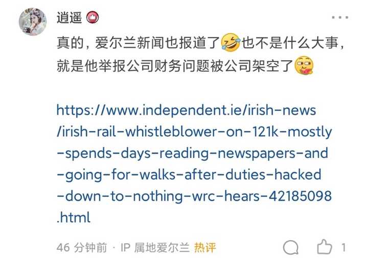- 230 个点赞 👍我前两天就看到这哥们了,妥妥的没有经过社会主义大熔炉改造,一年10几万欧的收入还在这里抱怨。 家庭收入分布图在爱尔兰的统计局貌似只更新到2016,现在应该更高了点,他一个人的收入就已经非常高了。 他在的公司是irish rail,就类似于铁路系统,爱尔兰的铁路系统非常的一般,基本上主要的交通还是靠长途大巴。 相同的路线,铁路和大巴价格差不多,有时候前者比后者还贵。 爱尔兰差不多有2300公里的铁路 中国有14.6万公里。 看到了吧,这哥们的公司才管多长一点儿。 并且从报纸上看,他没事干的原因,据他说是因为在2014年他揭发了公司财务违规,后被边缘化了。 也就是红框里的这段话。 他的诉求很简单,就是希望每周能得到至少一次的工作机会。 编辑于 2022-12-04 19:20・IP 属地英国查看全文>> 平凡