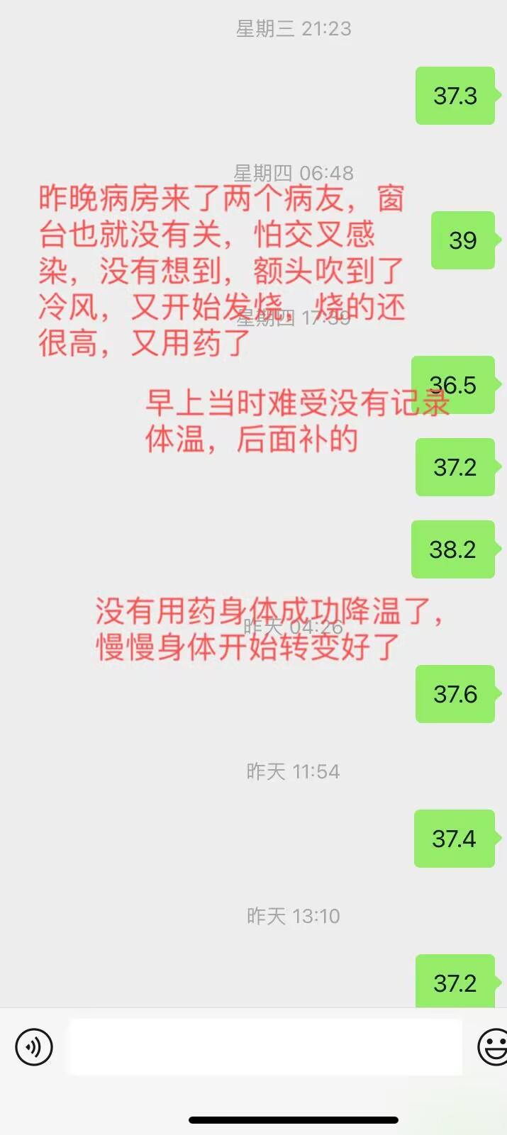 后面几天大家通过截图来了解一下我的治愈过程。我前几次烧到高烧都是用药才退烧的,后面那一次退烧是通过自己的物理散热实现降温的,物理降温成功后也就没有在发烧了。