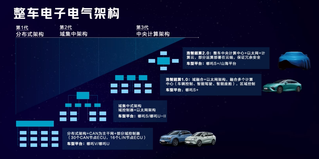 哪吒汽车初代平台EP12/EP30上使用的分布式架构,随后在EP31/EP40平台上使用了域集中式架构。直到不久前,哪吒发布的全新浩智超算2.0,使用的是中央计算架构,将会在后续车型上搭载。