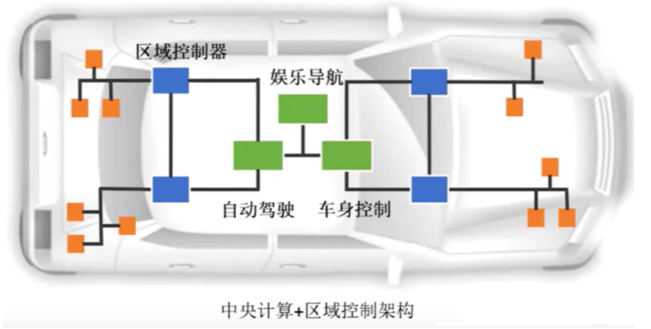 中央计算架构(域融合):顾名思义,就是所有的计算都归到中央进行计算,再将计算结果传递到每一个区域控制模块中,由该模块去实现具体的功能,这样的好处有很多,比如不需要这么多ECU去分别计算,把算力都集中在中央,集中力量办大事,而区域负责执行就可以了;再比如中央计算部分可以更快地统一协调全部区域控制模块,让每个模块都能联动起来,互相合作,弥补了域集中架构的不足。