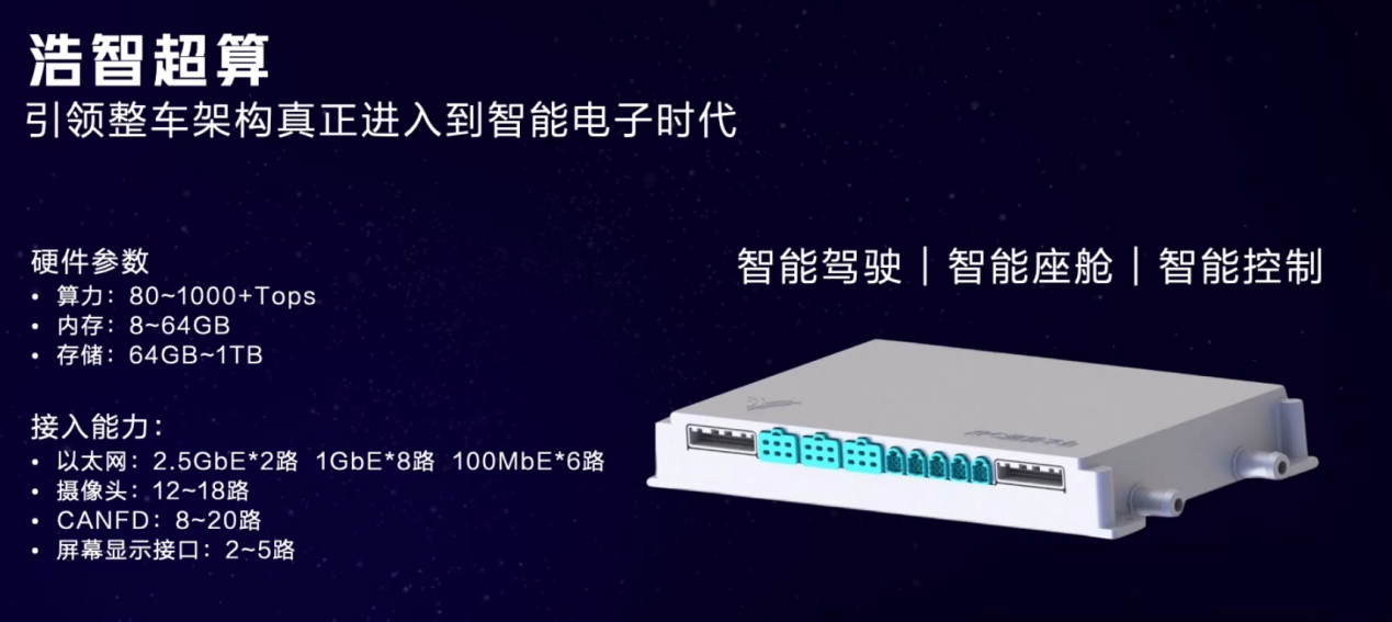 我们以 @哪吒汽车 的电控系统举例,其最新发布的浩智超算2.0是哪吒全栈自研中央计算平台,支持算力80~1000+Tops、支持内存8~64GB、支持储存64GB~1TB,支持多路以太网、12~18路摄像头、8~20路CANFD以及2~5路屏幕显示接口。