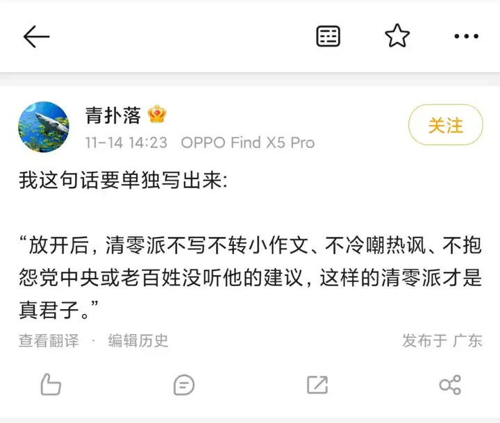 近几天我看网上已经有苗头了,共存派已经开始给自己提前写好免责书了,“放开后清零派别转我们的小作文,别抱怨放开后党和人民群众的身体健康受损,别阴阳怪气我们,就是君子”