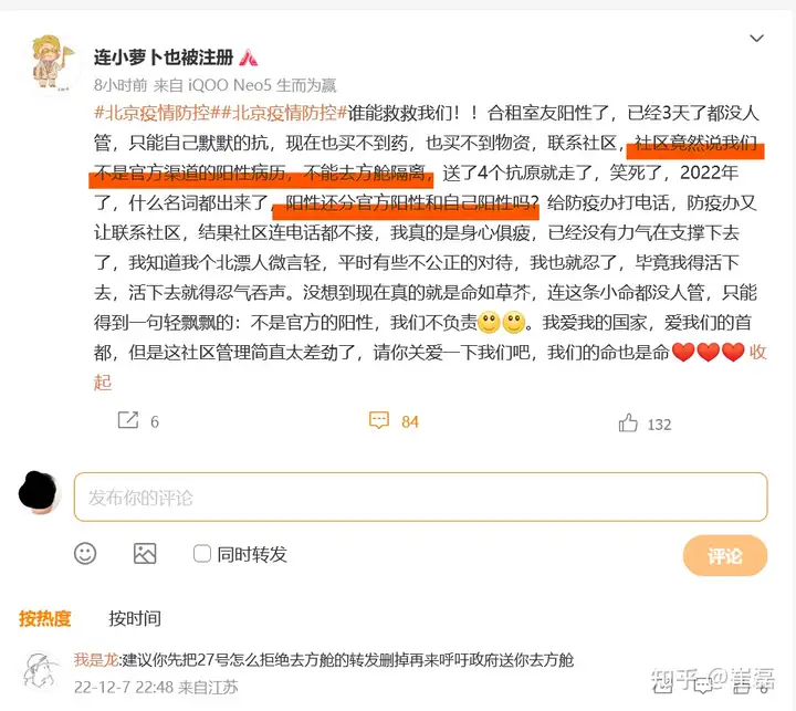 12月7日,有个博主说室友阳了,想去方舱,汇报社区,社区不认可非官方渠道阳性确诊,所以拒绝拉她去方舱。遂对社区颇为不满。