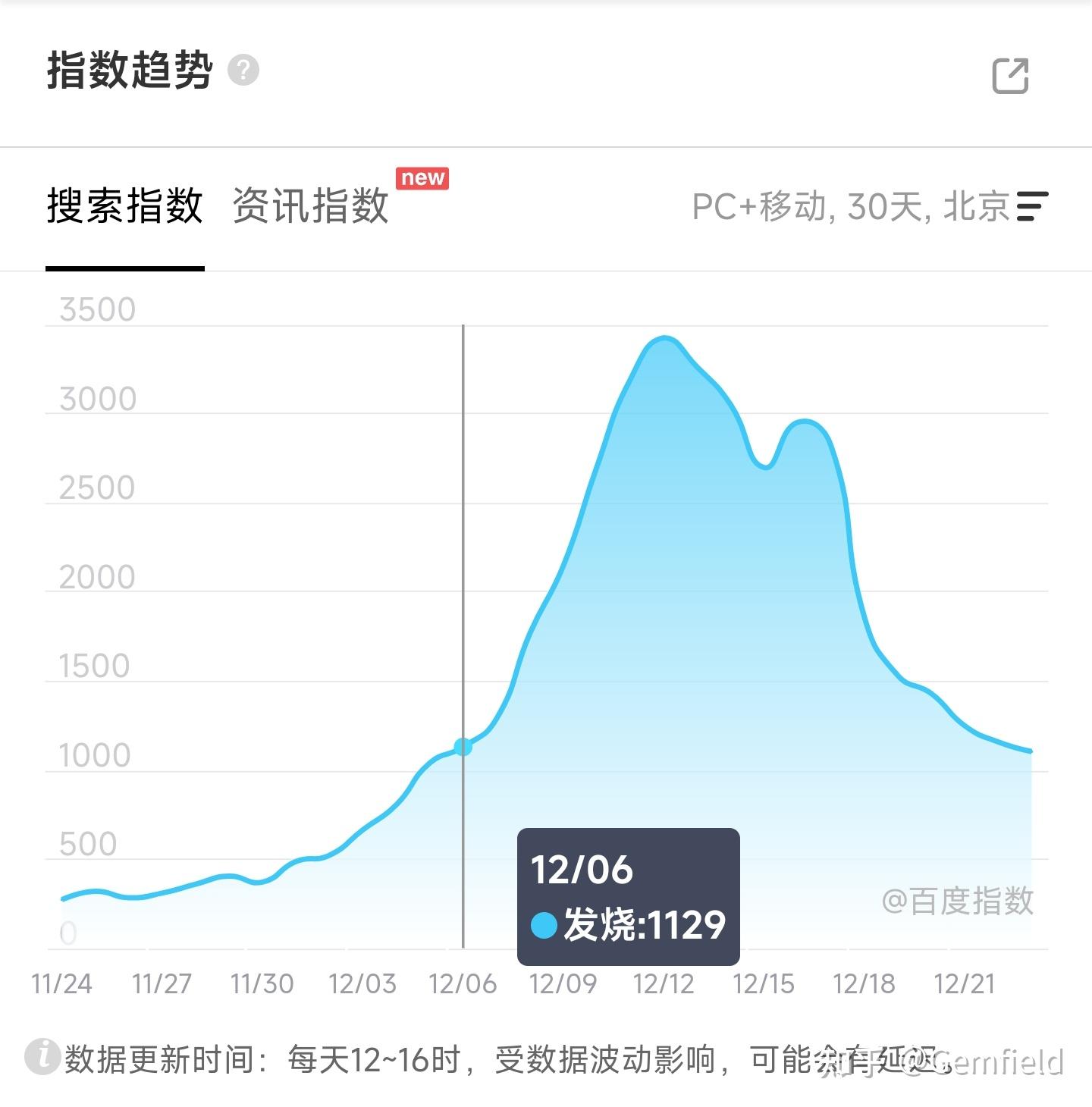 目前指数已经下降到12月6号左右的水平。注意图中的竖线,北京宣布放开是12月6日。而在宣布放开之前,已经出现了病毒的快速传播。