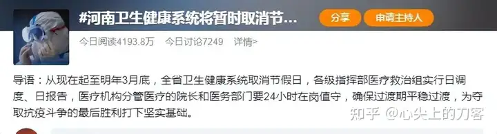 近日,河南省提出要求,从现在起至明年3月底,全省卫健系统取消节假日,目的是为了让医院扛过放开后的第一波冲击。
