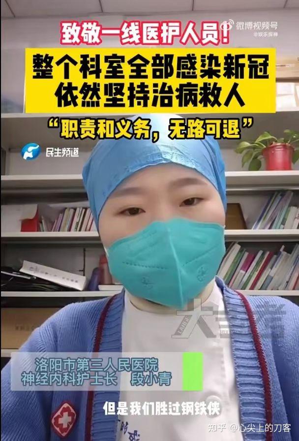 昨天,河南洛阳某医院一位医生在网上发布了一条视频,表示其科室人员全部感染,但是依然坚持给病人看病,肩上的责任让他们坚持到底:“我们虽然是血肉之躯,但是我们胜过钢铁侠”!