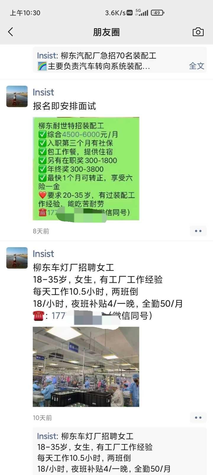 这是我微信的朋友圈,柳州的工厂工资水平差不多和深圳一个水平了,还是比较缺人。之前忘记码人家号码了,现码上