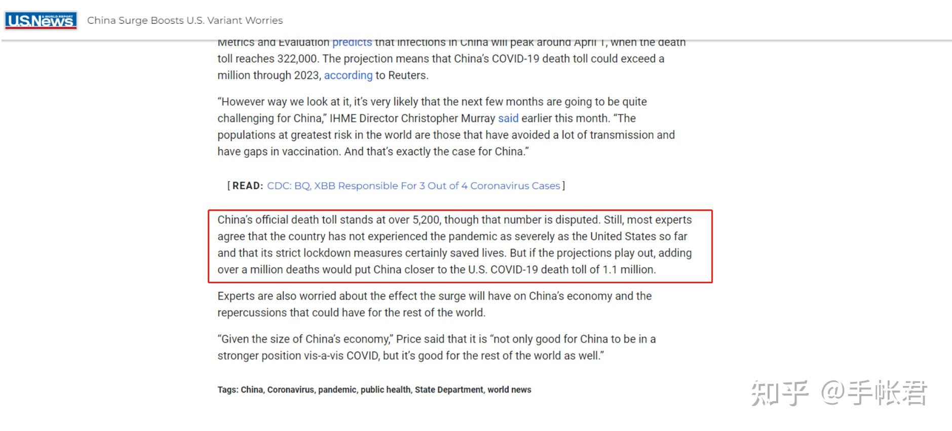 US NEWS认为中国之前的严格政策certainly saved lives,但放开后中国的死亡率将有可能接近美国的110万。