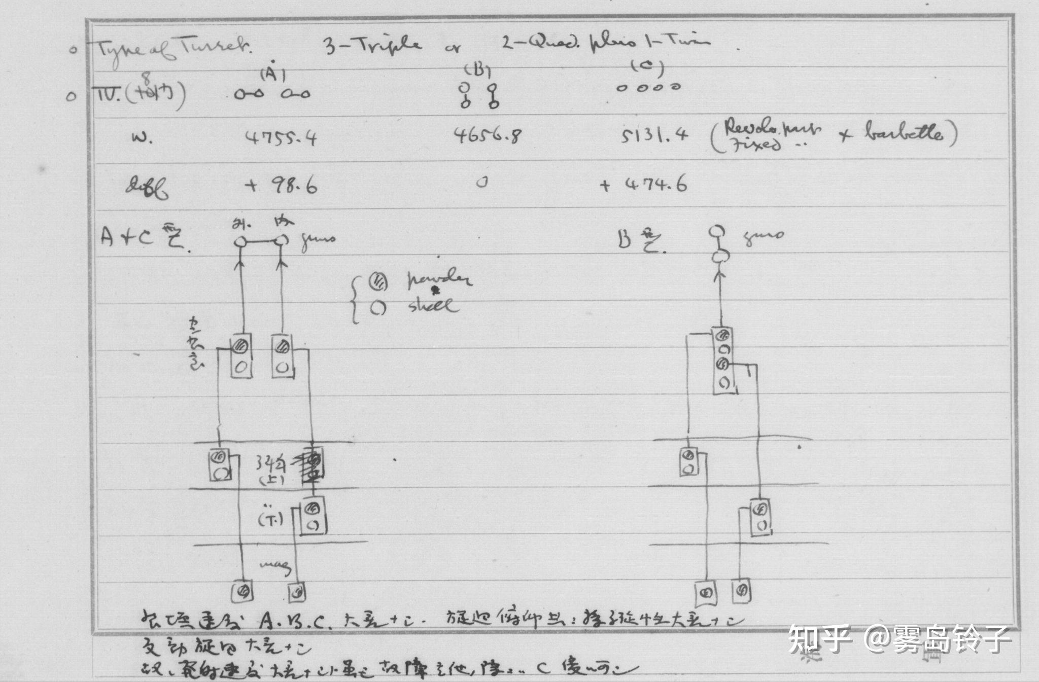 下图为昭和早年的表格,根据另一张格式类似的表格记录信息推测,应该是1927年4月前后的资料。其中,第二种四联装炮塔就是上下共鞍的田字布局。