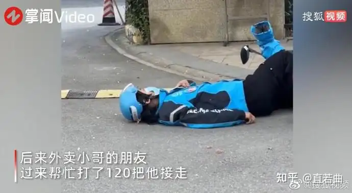 12月20日,江苏苏州。一名外卖小哥高烧39℃仍坚持送餐,不料送完餐后支撑不住瘫倒在地。拍摄者黄女士称平台人手紧缺派单量很大,他一天都没顾得上吃饭,加上高烧所以才会发生这一幕,后来外卖小哥的朋友过来帮忙打了120把他接走。