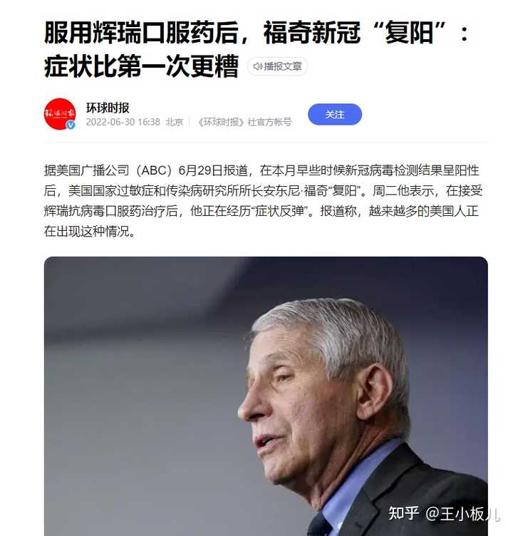 关于这个药美国人6月底的报道:81岁的福奇(已接种4针疫苗)阳了后一开始症状很轻,但有加重的趋势,老先生于是开始吃药,吃了5天,一个疗程结束,连测三天阴性,第四天又测,转阳,然后重新出现症状,而且比一开始的时候还严重了,大夫又给他开了一个疗程的药,又连吃5天,第四天的时候他说虽然症状还在,但是好多了,不是特别严重了。