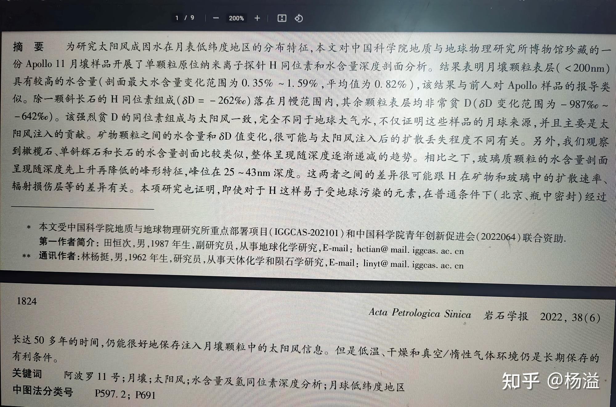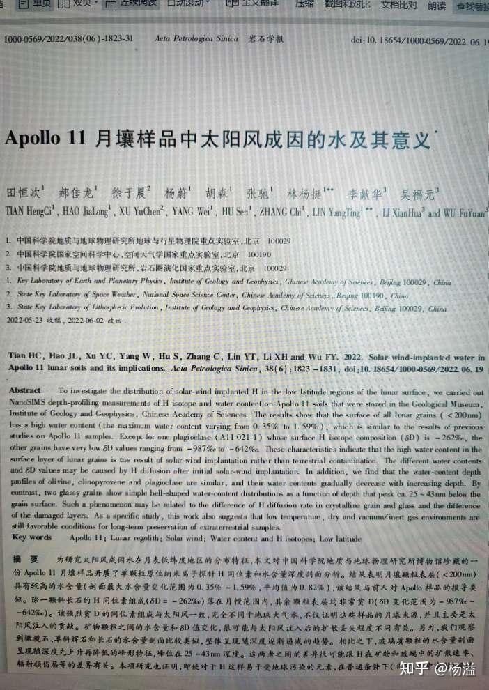使用NanoSIMS对阿波罗11号采回的月壤重新分析,同样可以发现月壤颗粒表面<200nm,富含水的非晶层,且氢同位素比值显示太阳风特征。有关研究使用的样品为上世纪美国赠送的月壤,保存单位是中科院地质与地球物理研究所,有关的论文2022年发表于《岩石学报》。