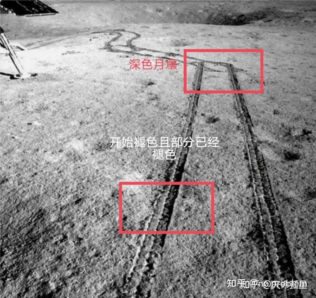 再来看下面这幅所谓的“证据”:前面分析过了,有点常识的人都能看出来,这是玉兔月球车回头照自己车辙的照片,靠近画面下端是新翻出来的土,画面上端才是之前几天翻出来的土,连这都看不懂,居然说新翻出来的土“已经褪色”,几天前翻出来的土反而是“深色月壤”有糖霜现象???