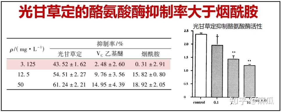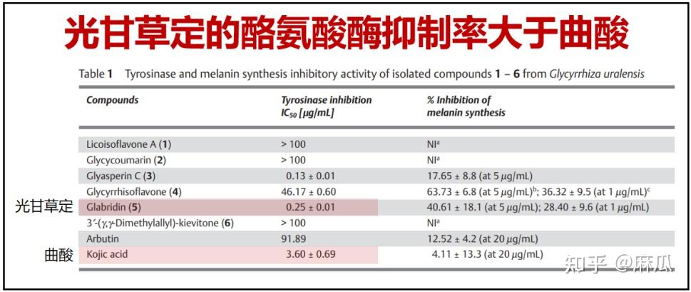 2005年,有个甘草提取组分抑制酪氨酸酶的研究,从中看到低量光甘草定即可抑制酪氨酸酶,效果是曲酸的14.4倍[4]。