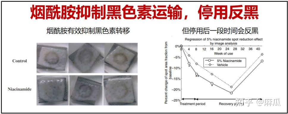 烟酰胺只能阻止黑色素小体转移,无法从源头抑制黑色素,治标不治本,停用烟酰胺容易反黑。