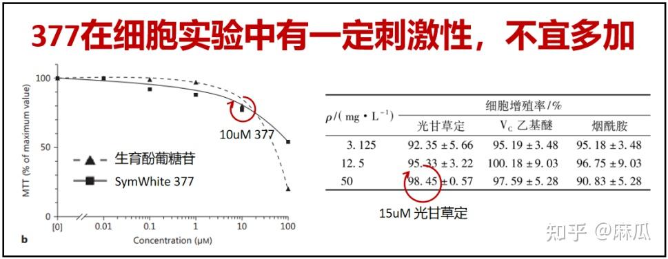 之前一项细胞研究中显示,10uM的377中,细胞增殖降低20%[5]。而15uM (约50mg/L)的光甘草定中,细胞增殖只降低2%[3]。同为间苯二酚衍生物,377的刺激性略高一些。