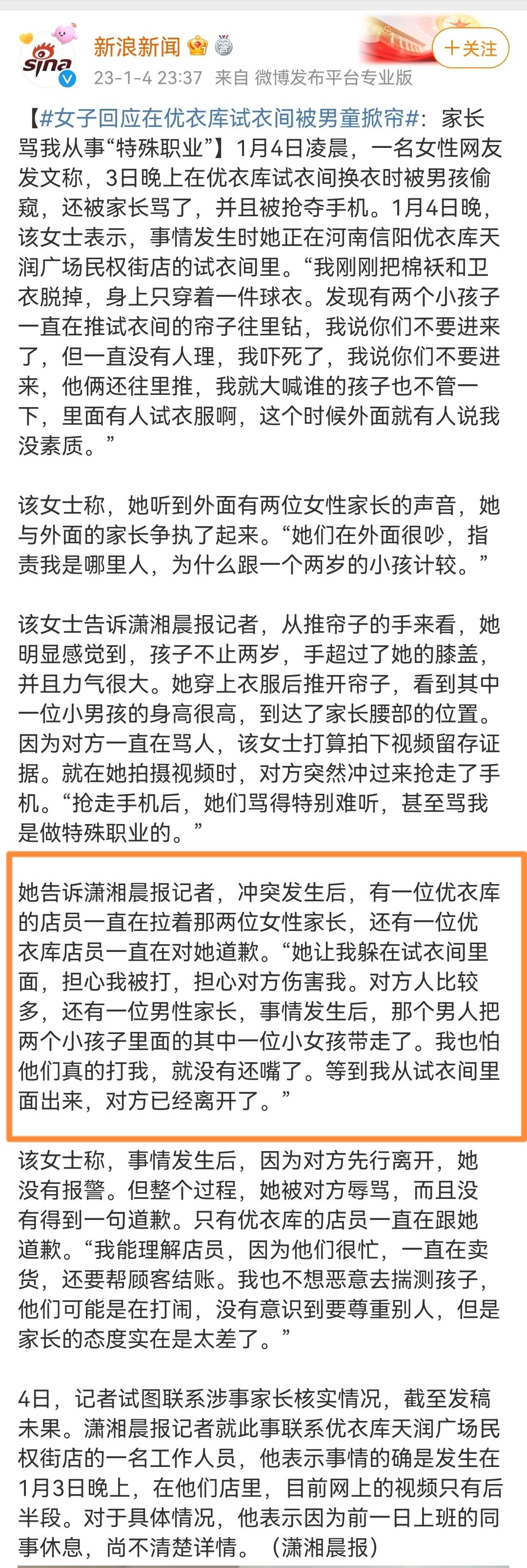 非常标准且拙劣的假新闻……“女子在优衣库遭两男童推帘”为非常严重的错误信息,正确标题应为“女子在优衣库试衣遭两孩童推帘”。我甚至可以说,这个假新闻没有任何关注的价值。