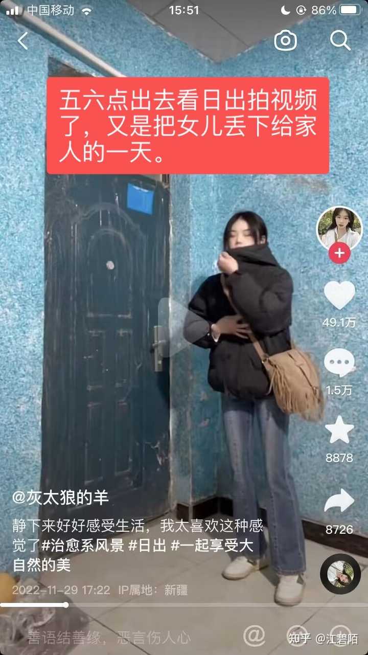 为了塑造自己热爱生活的文艺青年形象,五六点起来看日出,把女儿丢在家里吃屁喝风,口口声声说爱女儿,却一次次只顾自己成名拍视频,把女儿丢给家人管,然后污蔑男方不管孩子,大概两岁的女儿不需要任何人照料,迎风就长吧!