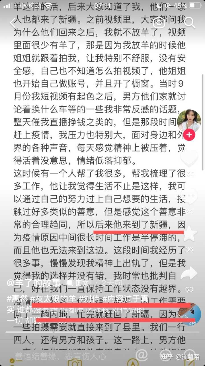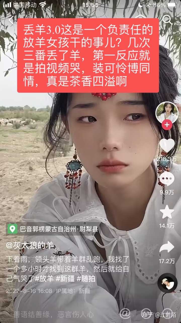 声称自己是平凡的放羊女孩,只顾自己追名逐利,营造形象,心思完全不在放羊上,羊从600只锐减到450只,丢了羊扮可怜受害者蒙混过关,心疼男方损失惨重呀。