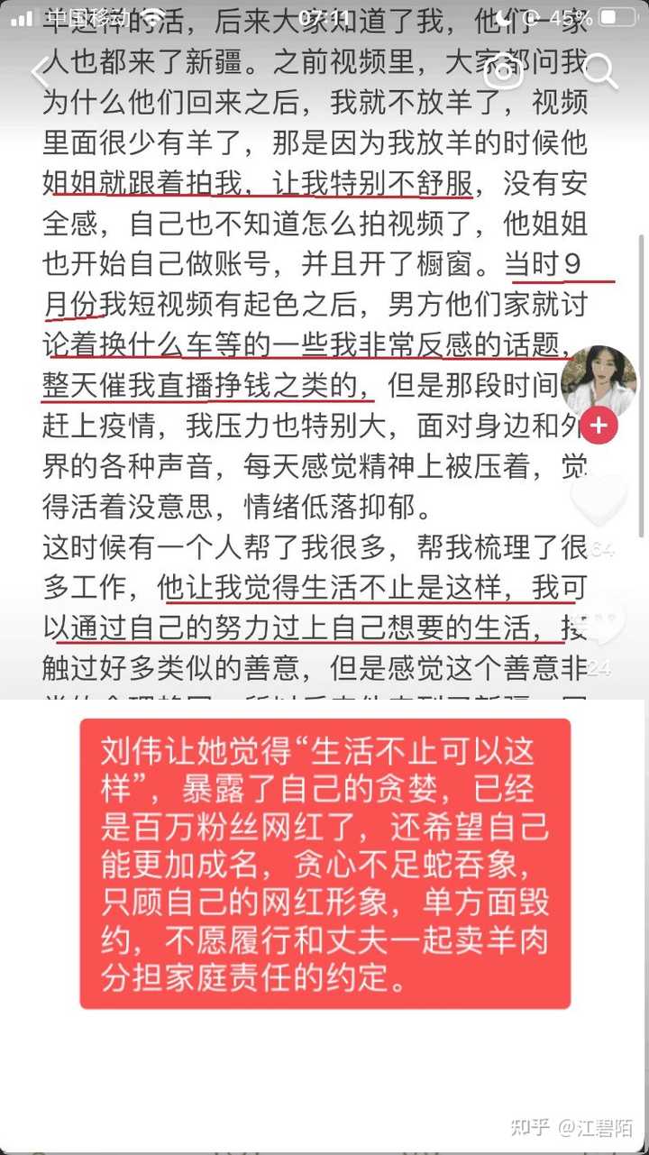 实际上为了在粉丝面前树立干干清爽的小姑娘人设,不功利不商业化,维护自己的“伟光正”形象,把先前和丈夫约定一起卖羊肉分担家庭责任的话抛诸脑后。