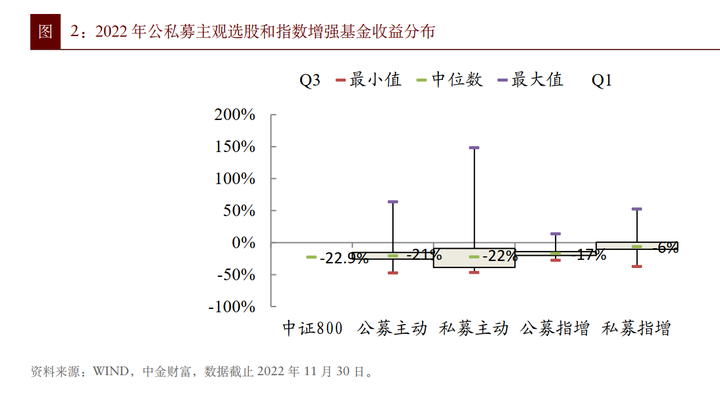 去年公募主动基金收益中位数-21%,私募主动基金收益中位数-22%。
