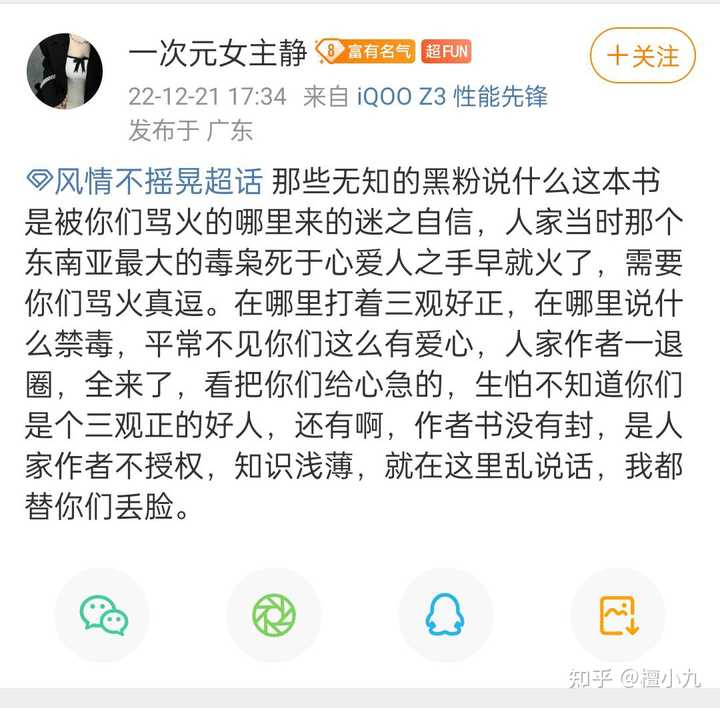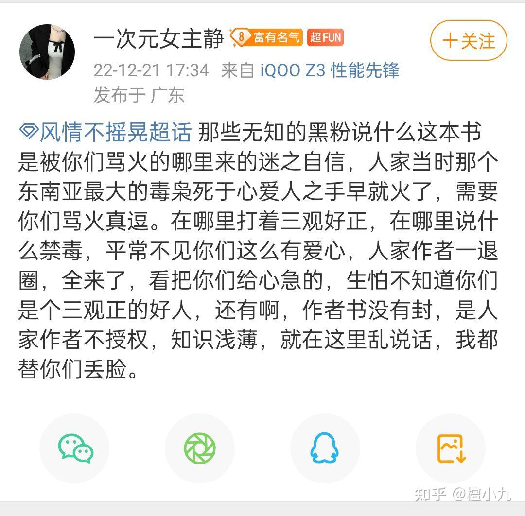 最后求生欲,我觉得《风情不摇晃》被禁,是应该的。有人把这本小群体自嗨的网文,拉到这种高度和热度,我也不知道这群人出于什么目的。我认为很大可能是他们越是批判这本书的三观不正,越是觉得这样衬托自己的三观倍儿正。已经到了这个地步,这个局面,官方不顺势出来立威,我都觉得对不起他们,对吧。