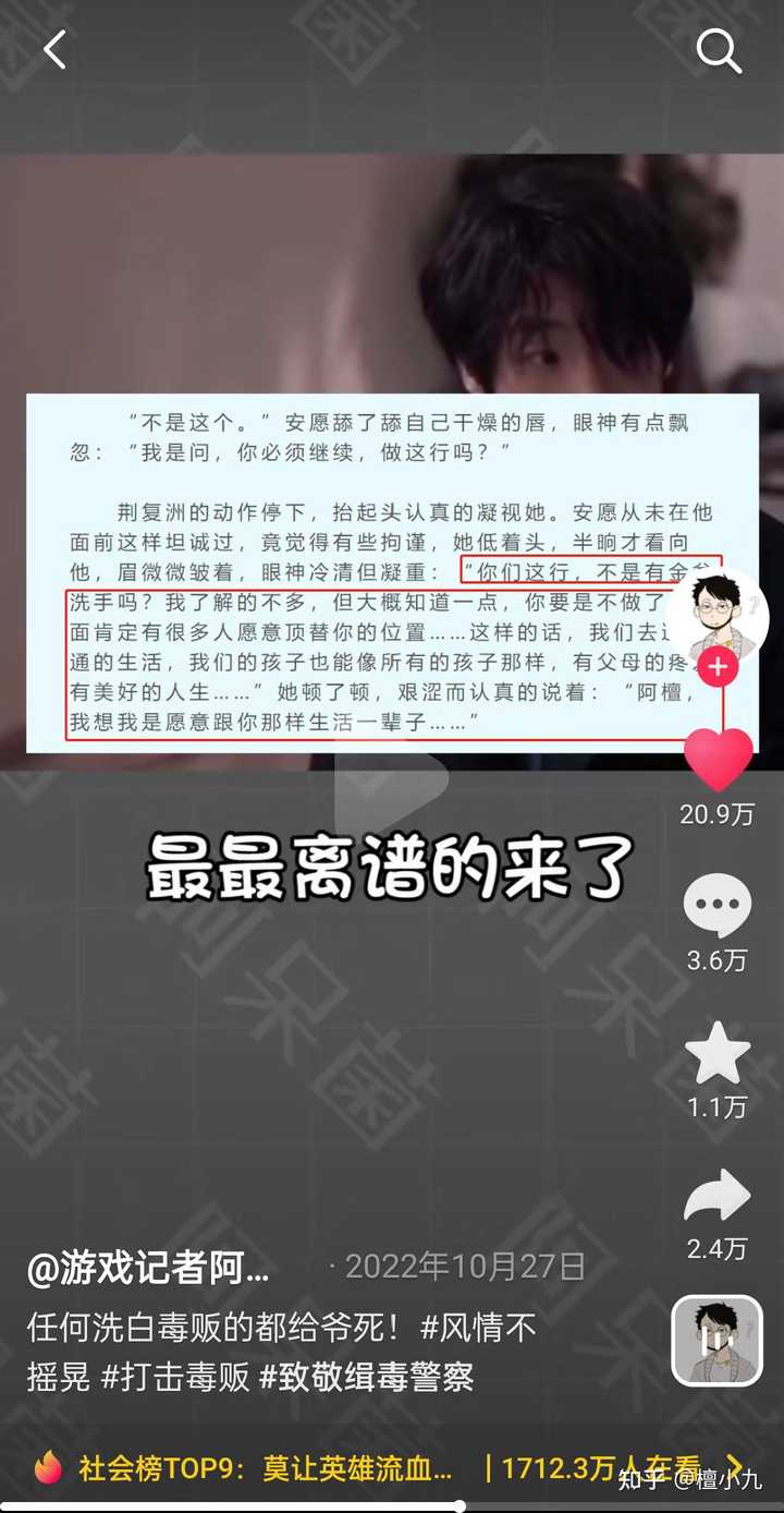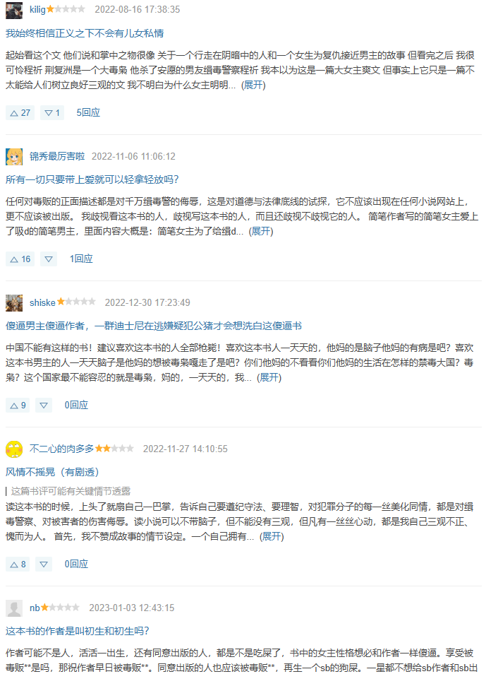 但这本书完全没有问题么?是有问题的。也就是大家都在吐槽的美化男主,以及女主的感情。在这本书中毒贩男主被刻画的年轻英俊,对女主一往情深。这是美化么?那当然是美化。这是很多言情网文的通病,男女主不设定点高人一等的地方比如颜值、智商什么的,就写不下去。这也就是这本书歪的地方,而且明显不合逻辑,这个作者明显都没去了解过真实的毒贩。