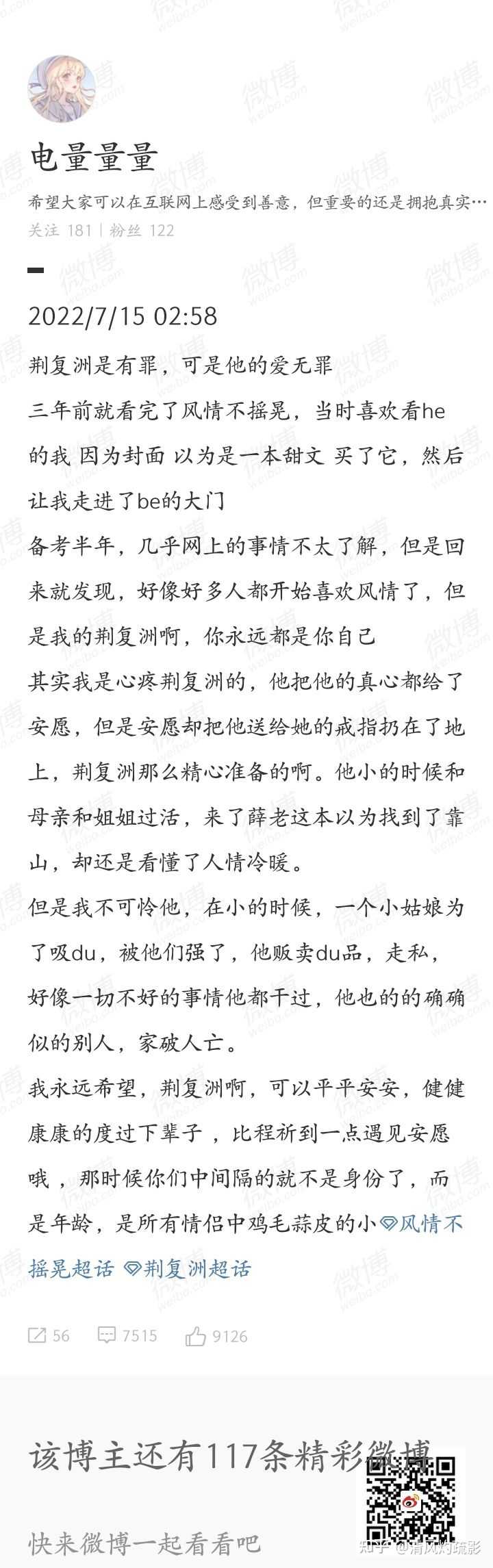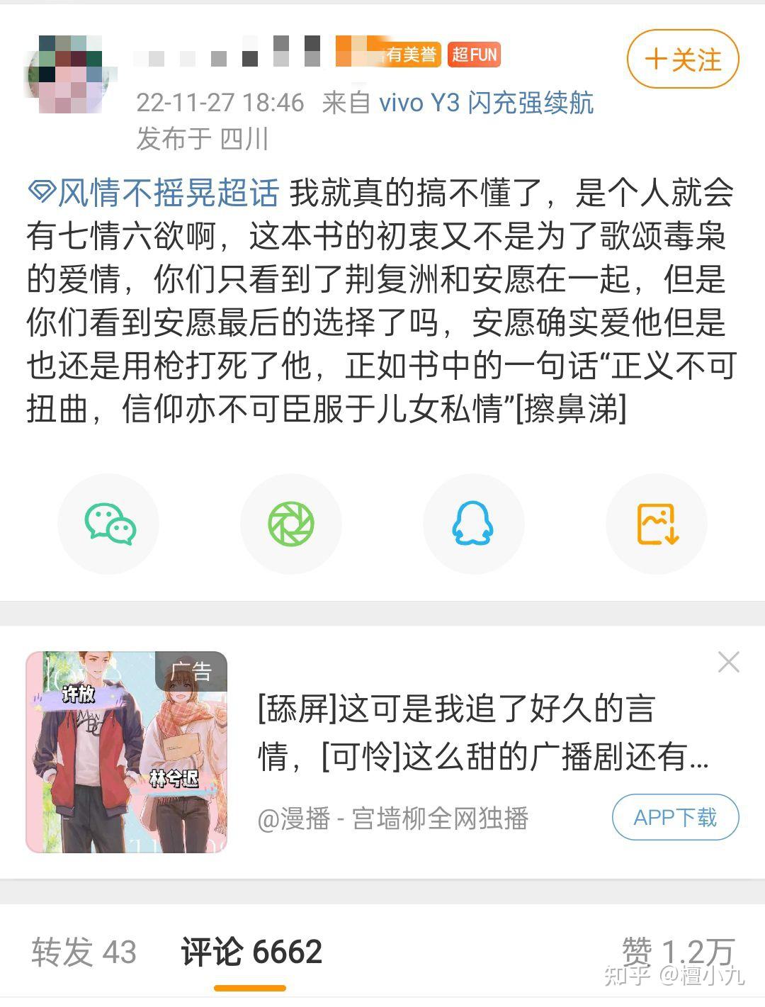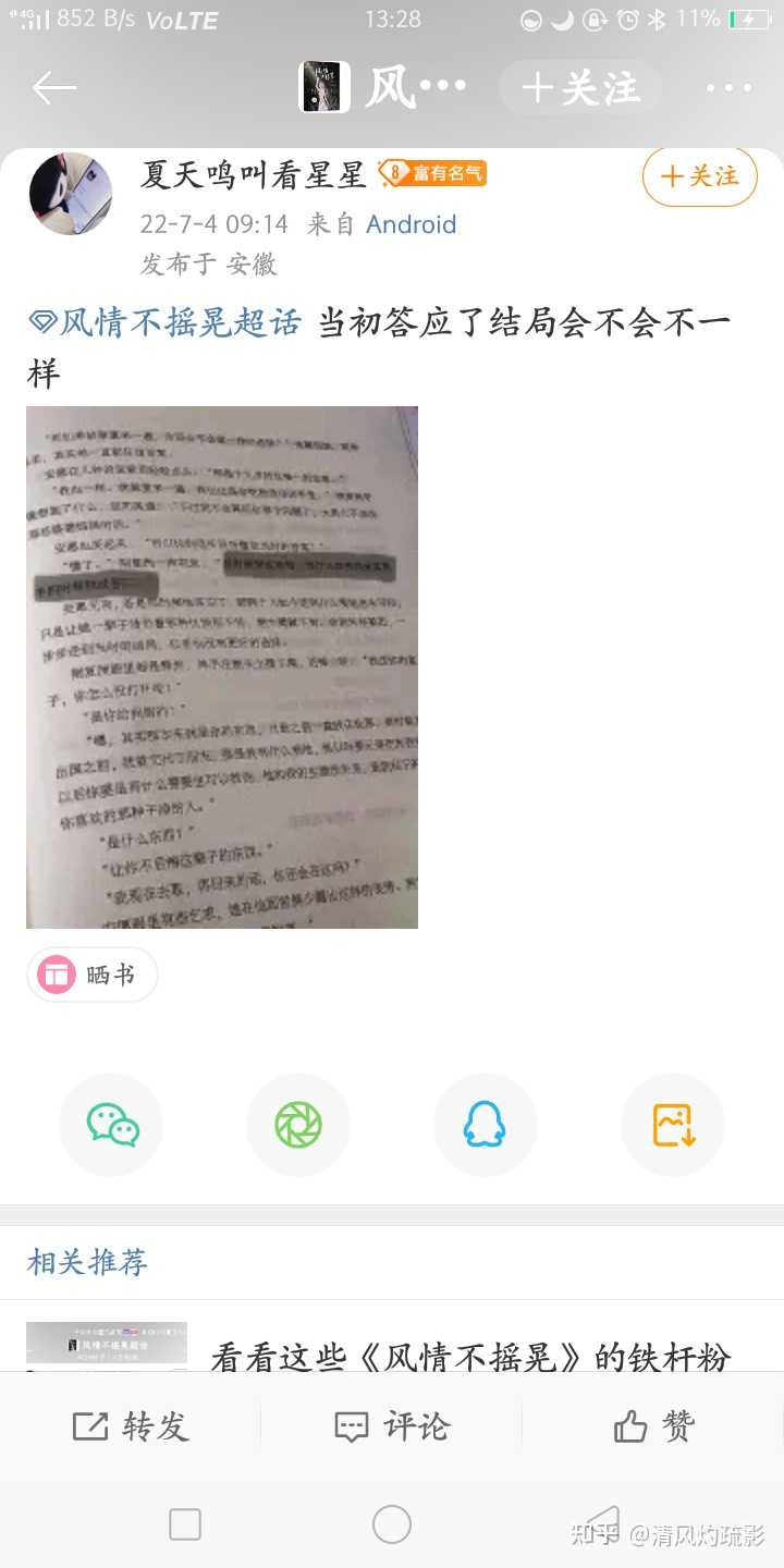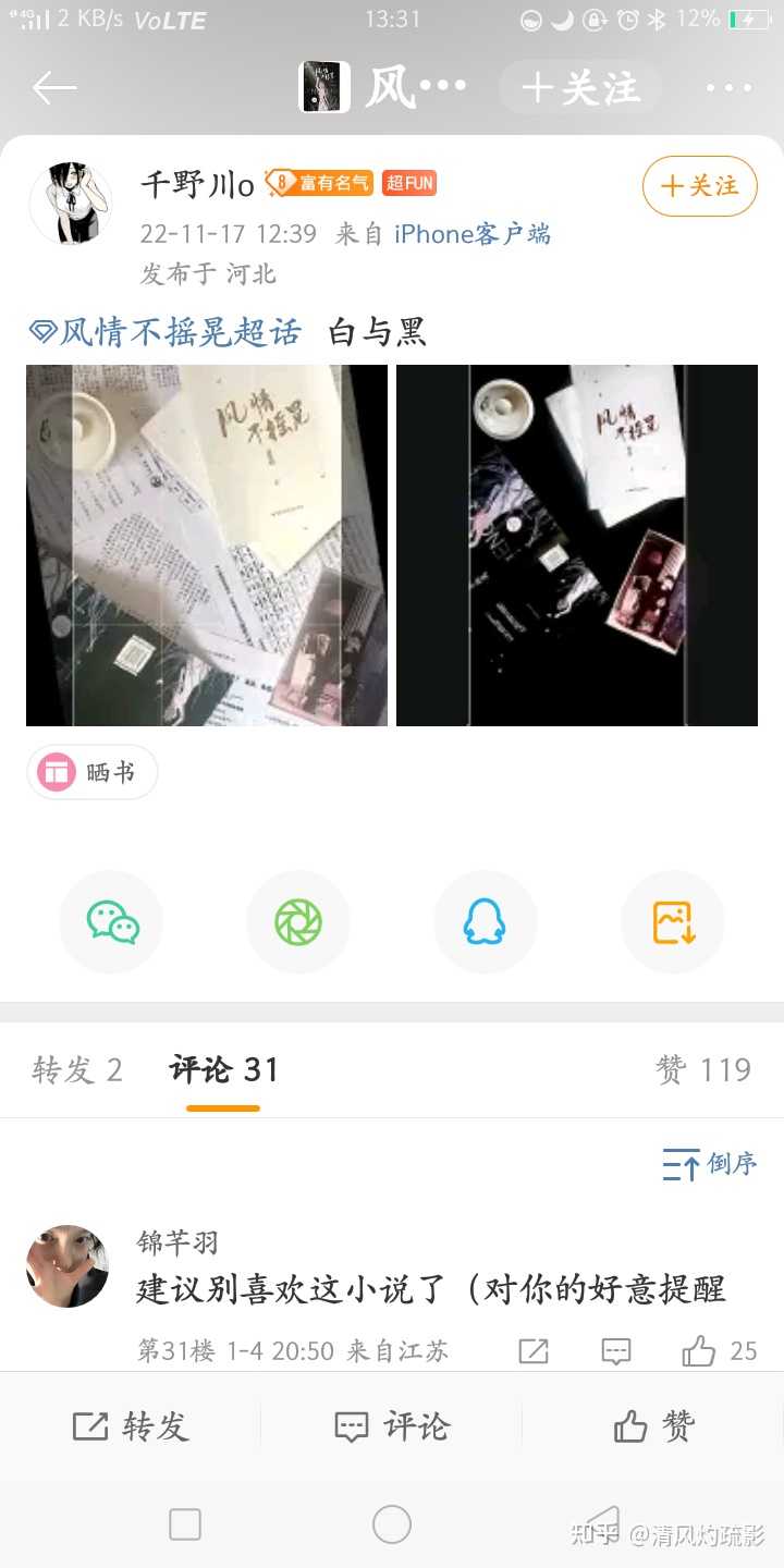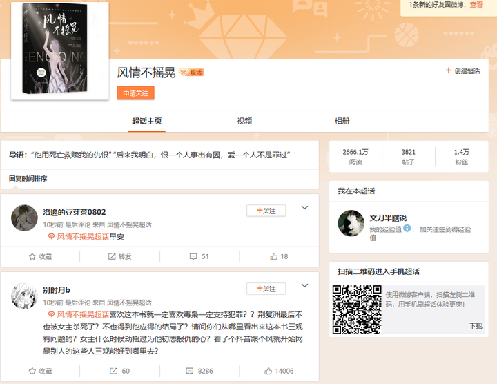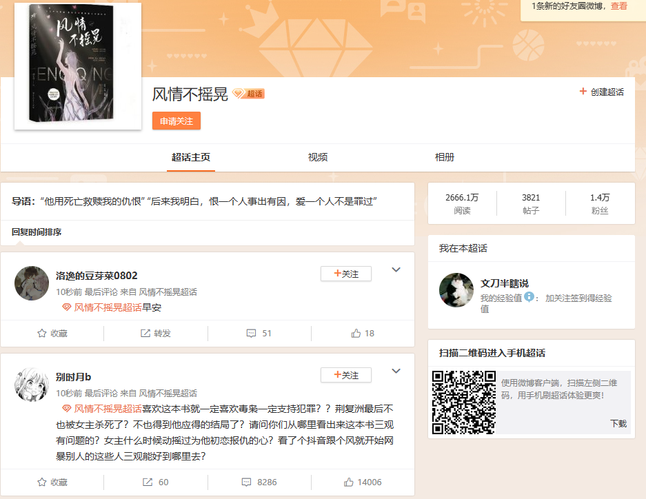 其次这本书是本网络小说,还是bg文。网文圈耽美大行的情况,我想爱看网文小说的人不可能不知道。bg文是势微到近几年已经没有任何一本bg文能和BL文相抗衡的了。像《风情不摇晃》这种水平的文,是扔进虐文堆里面找不到的。因为其文笔,情节,人设通通乏善可陈,勉强算个及格水平。早几年,可能完全石沉大海,冒不了头。我本人加了十几个小说群,身边朋友也个顶个是网文资深爱好者,在被点名前统统不知道或者没读过这本书。如果没有那几位“正义使者”的up主的激情开麦,知道这本书的人,我想也相对来说很少。可以说在被这几位up主点名前,这本书是算得上小众的。这便是我所说的这本书现在的待遇不配,的原因之一。