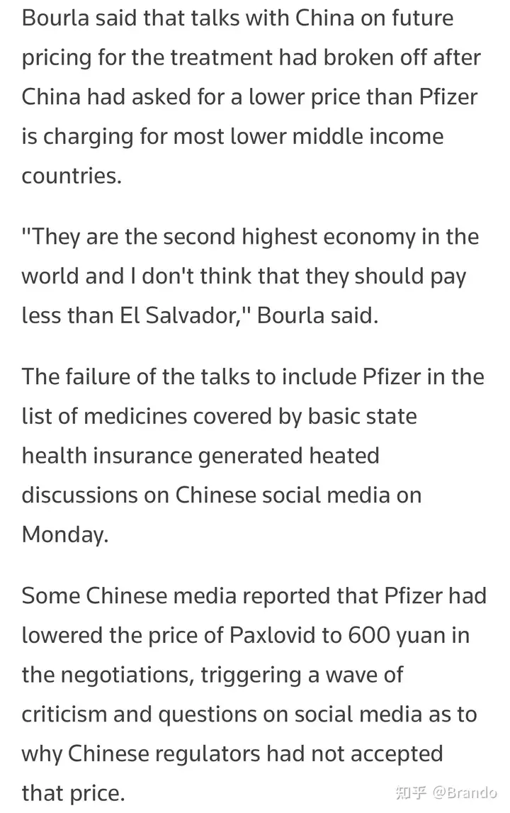 今天辉瑞官方宣布,他们的报价低于300美元,仅高于像萨尔瓦多这样极端贫困的国家,远低于台湾地区(约500美元)。辉瑞老总表示,中国一边宣布彻底消除了贫困,一边又要我们以扶贫价格出售药物,这令人无法接受。或许他们认为花300美元拯救一条生命太贵了……(洋人嘴巴太毒) P.S.台湾地区的居民购买此药物时,只需支付新台币数百元,其余部分由政府承担。