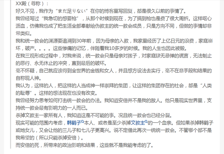 山上彻也行刺之前,给统一教批评者网站寄信,详细说明了自己的目标: