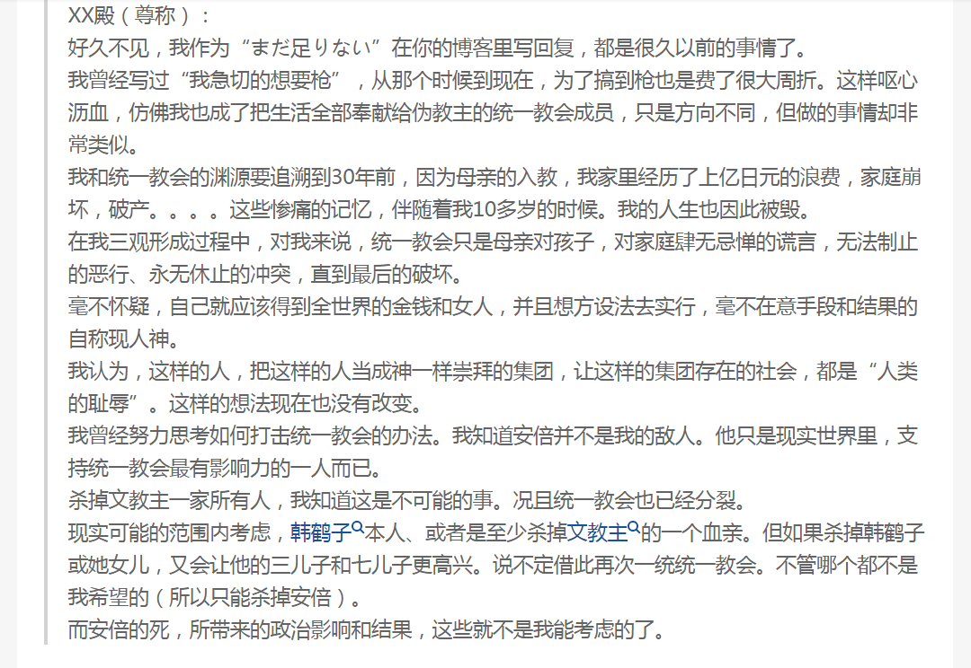 山上彻也行刺之前,给统一教批评者网站寄信,详细说明了自己的目标: